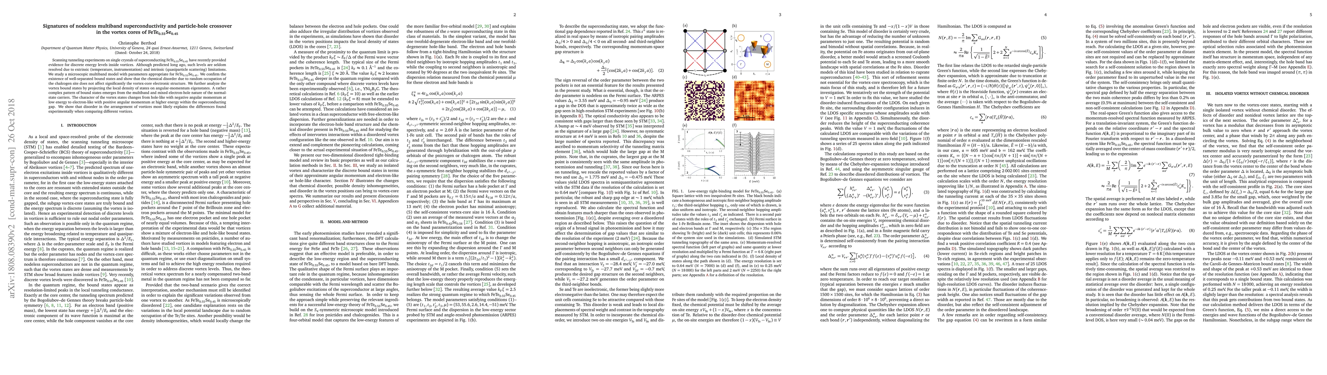 This study reveals signatures of nodeless multiband superconductivity in FeTe$_{0.55}$Se$_{0.45}$ through scanning tunneling experiments, showing discrete energy levels within vortex cores. The analysis of a microscopic multiband model indicates a crossover from hole-like to electron-like vortex states, suggesting a complex interplay between multiband effects and particle-hole symmetry.