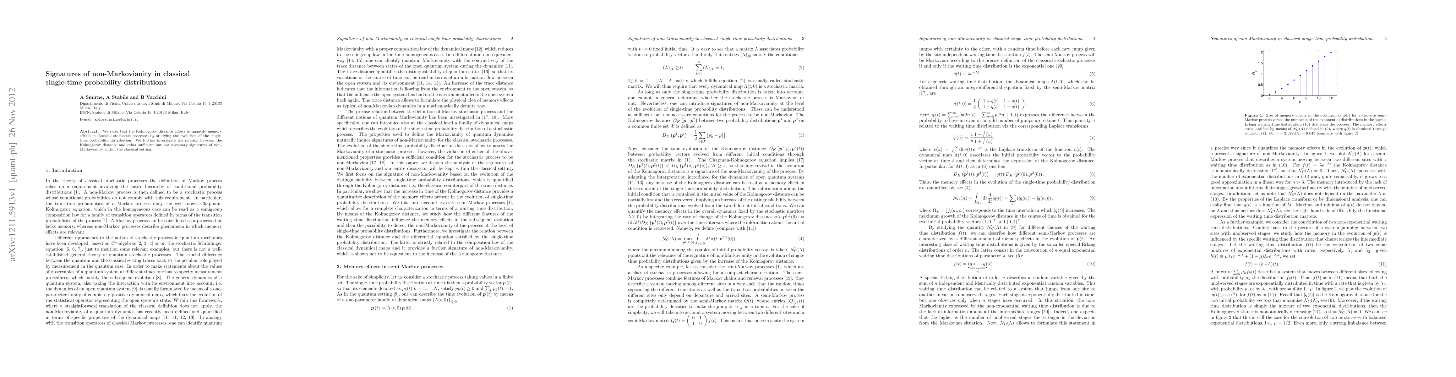 This research introduces the use of Kolmogorov distance to measure memory effects, or non-Markovianity, in classical stochastic processes by examining single-time probability distribution evolution. It explores the relationship between Kolmogorov distance and other non-Markovian signatures within classical systems.