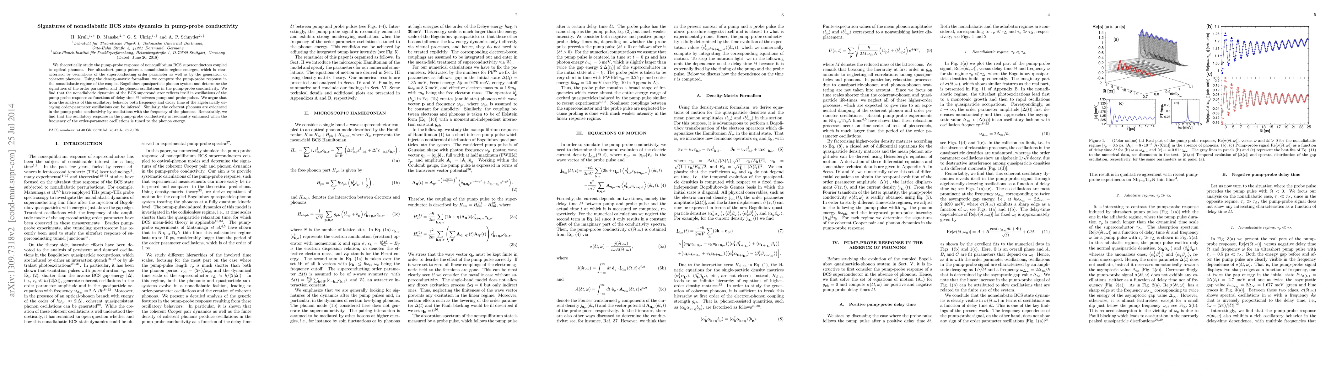 This paper explores the nonadiabatic dynamics of BCS superconductors under pump-probe experiments using density-matrix formalism, revealing oscillations in the superconducting order parameter and coherent phonons. The study finds that the pump-probe conductivity exhibits resonant oscillations, allowing for the inference of order parameter decay times and phonon frequencies.