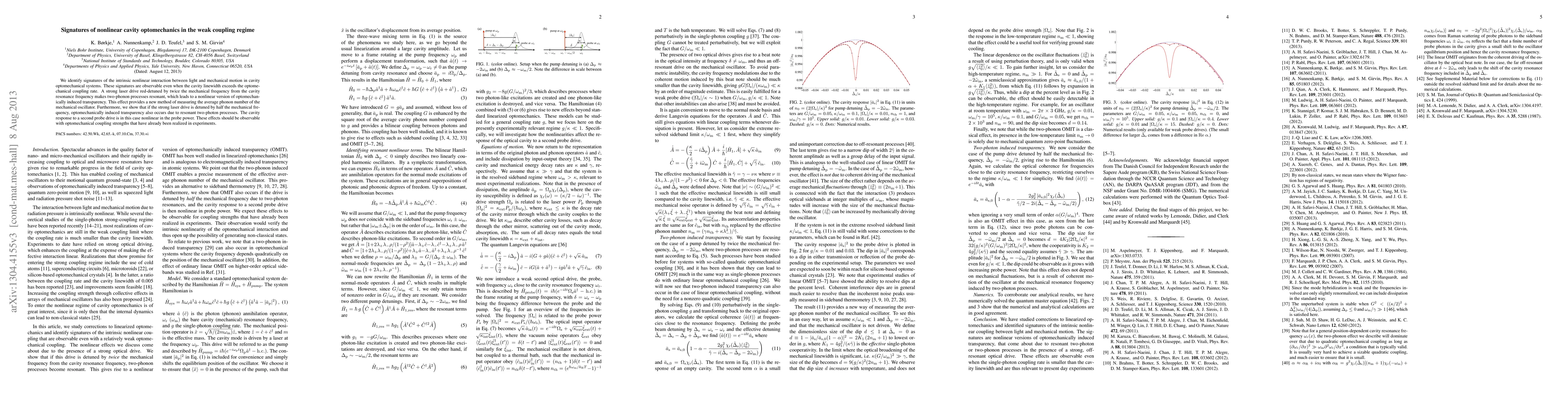 This paper explores nonlinear interactions in cavity optomechanics, revealing signatures of intrinsic light-mechanical coupling even in the weak coupling regime. It demonstrates optomechanically induced transparency via resonant two-phonon processes and shows a nonlinear response to a probe drive, providing new methods for measuring mechanical oscillator phonon numbers.