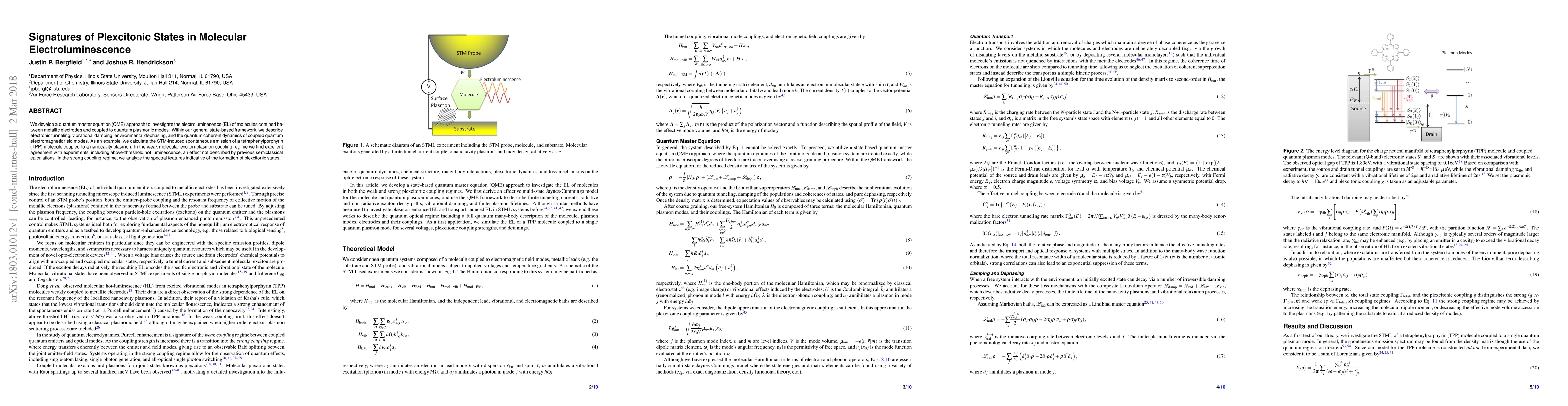This paper develops a quantum master equation to study molecular electroluminescence, focusing on tetraphenylporphyrin molecules coupled to plasmonic modes. It reveals signatures of plexcitonic states in spectral features, especially in strong coupling regimes, showing above-threshold hot luminescence and agreement with experimental data.