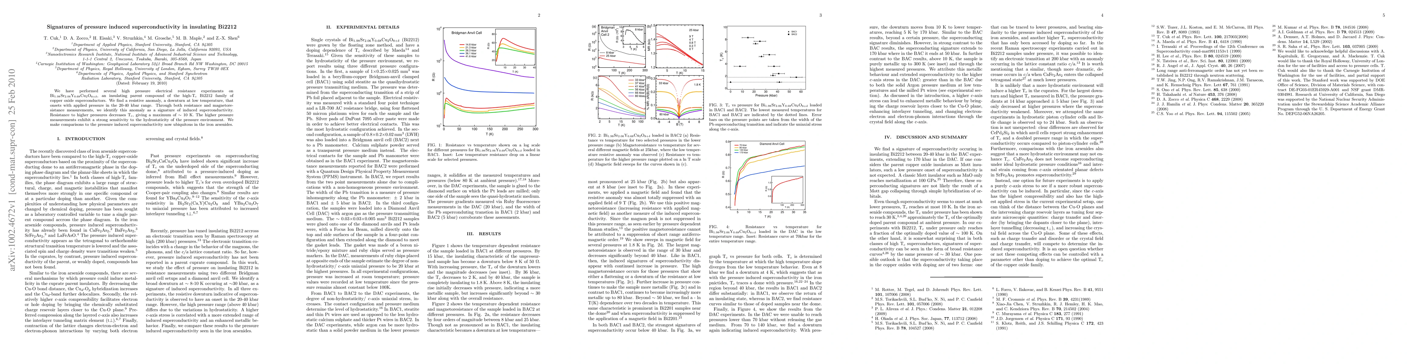 We have performed several high pressure electrical resistance experiments on Bi1.98Sr2.06Y0.68Cu2O8, an insulating parent compound of the high-Tc Bi2212 family of copper oxide superconductors. We find a resistive anomaly, a downturn at low temperature, that onsets with applied pressure in the 20-40 kbar range. Through both resistance and magnetoresistance measurements, we identify this anomaly as a signature of induced superconductivity. Resistance to higher pressures decreases Tc, giving a maximum of 10 K. The higher pressure measurements exhibit a strong sensitivity to the hydrostaticity of the pressure environment. We make comparisons to the pressure induced superconductivity now ubiquitous in the iron arsenides.