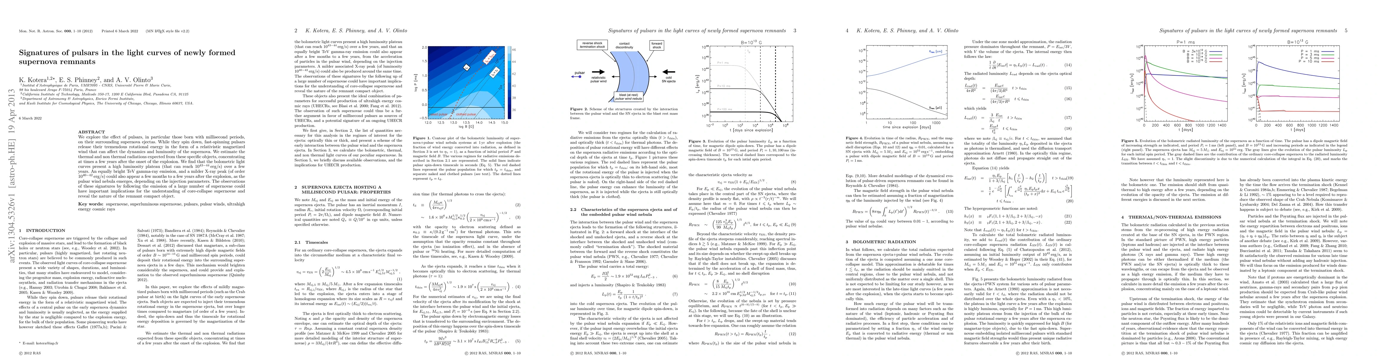 We explore the effect of pulsars, in particular those born with millisecond periods, on their surrounding supernova ejectas. While they spin down, fast-spinning pulsars release their tremendous rotational energy in the form of a relativistic magnetized wind that can affect the dynamics and luminosity of the supernova. We estimate the thermal and non thermal radiations expected from these specific objects, concentrating at times a few years after the onset of the explosion. We find that the bolometric light curves present a high luminosity plateau (that can reach $10^{43-44}\,$erg/s) over a few years. An equally bright TeV gamma-ray emission, and a milder X-ray peak (of order $10^{40-42}\,$erg/s) could also appear a few months to a few years after the explosion, as the pulsar wind nebula emerges, depending on the injection parameters. The observations of these signatures by following the emission of a large number of supernovae could have important implications for the understanding of core-collapse supernovae and reveal the nature of the remnant compact object.