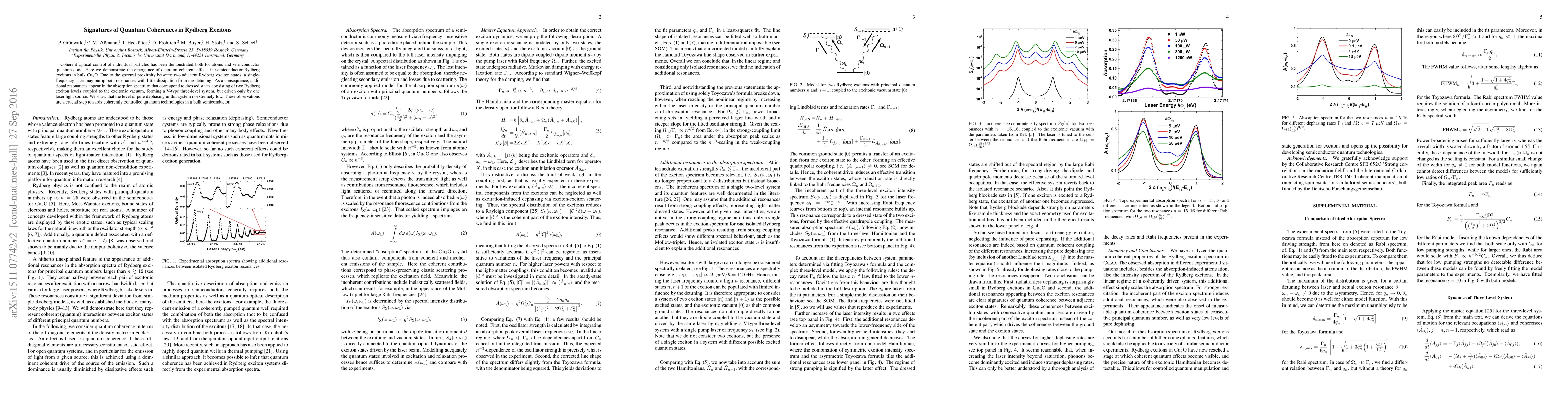 Coherent optical control of individual particles has been demonstrated both for atoms and semiconductor quantum dots. Here we demonstrate the emergence of quantum coherent effects in semiconductor Rydberg excitons in bulk Cu$_2$O. Due to the spectral proximity between two adjacent Rydberg exciton states, a single-frequency laser may pump both resonances with little dissipation from the detuning. As a consequence, additional resonances appear in the absorption spectrum that correspond to dressed states consisting of two Rydberg exciton levels coupled to the excitonic vacuum, forming a V-type three-level system, but driven only by one laser light source. We show that the level of pure dephasing in this system is extremely low. These observations are a crucial step towards coherently controlled quantum technologies in a bulk semiconductor.
