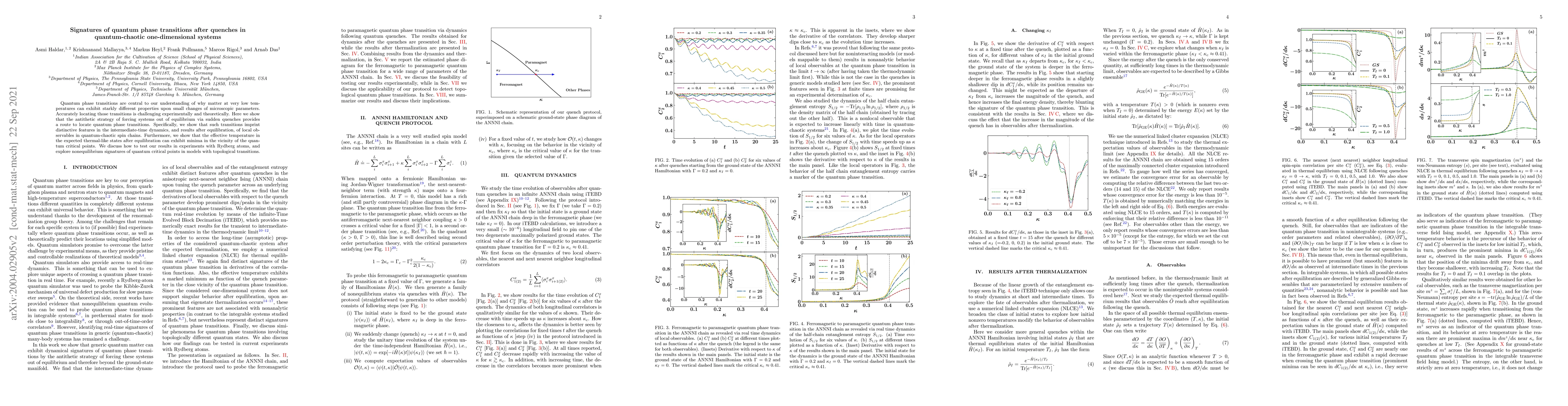 This paper demonstrates that quantum phase transitions in one-dimensional quantum chaotic systems can be identified through distinctive features in the dynamics and equilibrated states following sudden quenches. It also highlights the presence of minima in the effective temperature near critical points, suggesting practical experimental tests using Rydberg atoms.