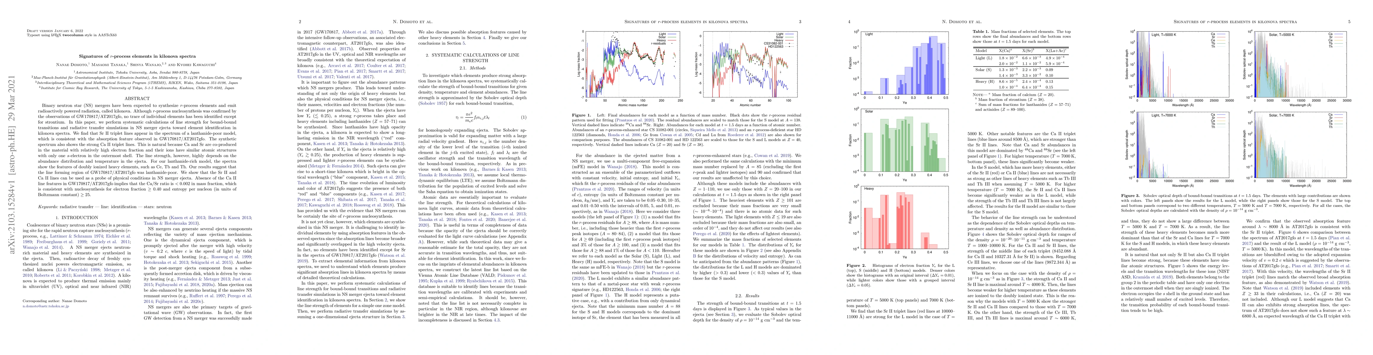 Research identifies signatures of r-process elements in kilonova spectra, including Sr II triplet lines and Ca II triplet lines, which can be used to probe physical conditions in NS merger ejecta. The study suggests that the line forming region of GW170817/AT2017gfo was lanthanide-poor.