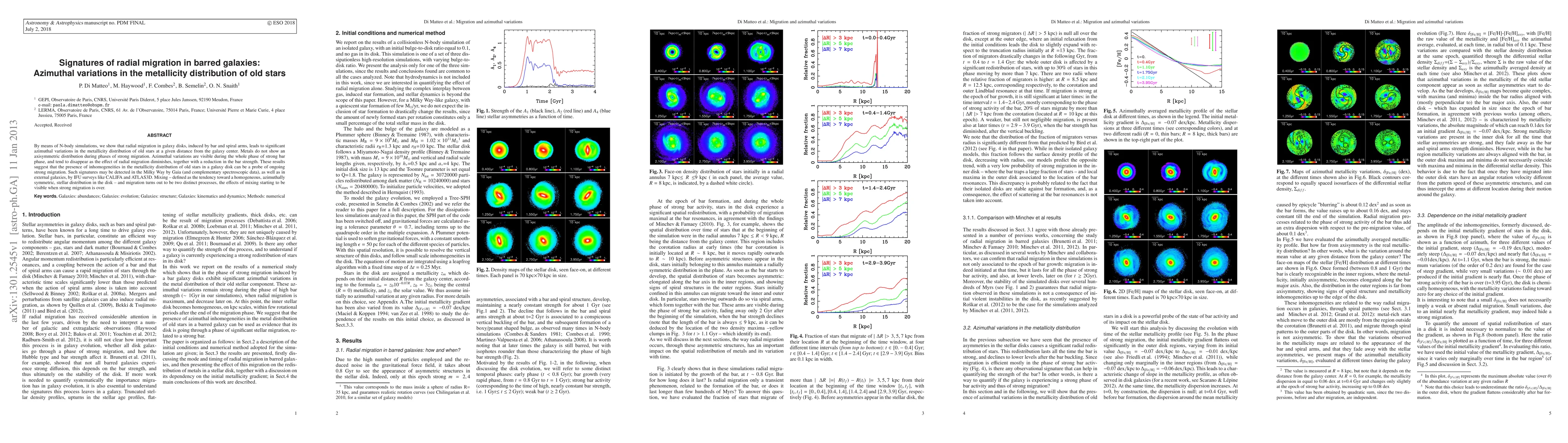 This study demonstrates through N-body simulations that radial migration in barred galaxies results in non-axisymmetric metallicity distributions among old stars, indicating ongoing strong migration. These variations in metallicity fade as migration diminishes, suggesting that such inhomogeneities can reveal ongoing migration in galaxies like the Milky Way and others observed by surveys such as Gaia, CALIFA, and ATLAS3D.