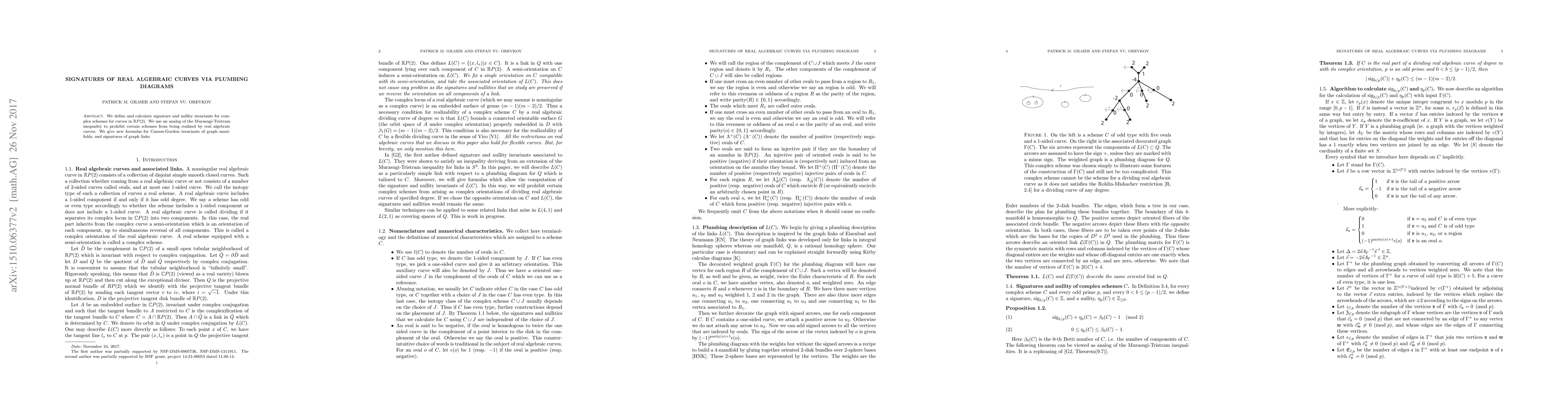 The paper defines signature and nullity invariants for complex schemes of real algebraic curves in the projective plane using plumbing diagrams, and establishes an analog of the Murasugi-Tristram inequality to prohibit certain schemes from being realized by real algebraic curves.