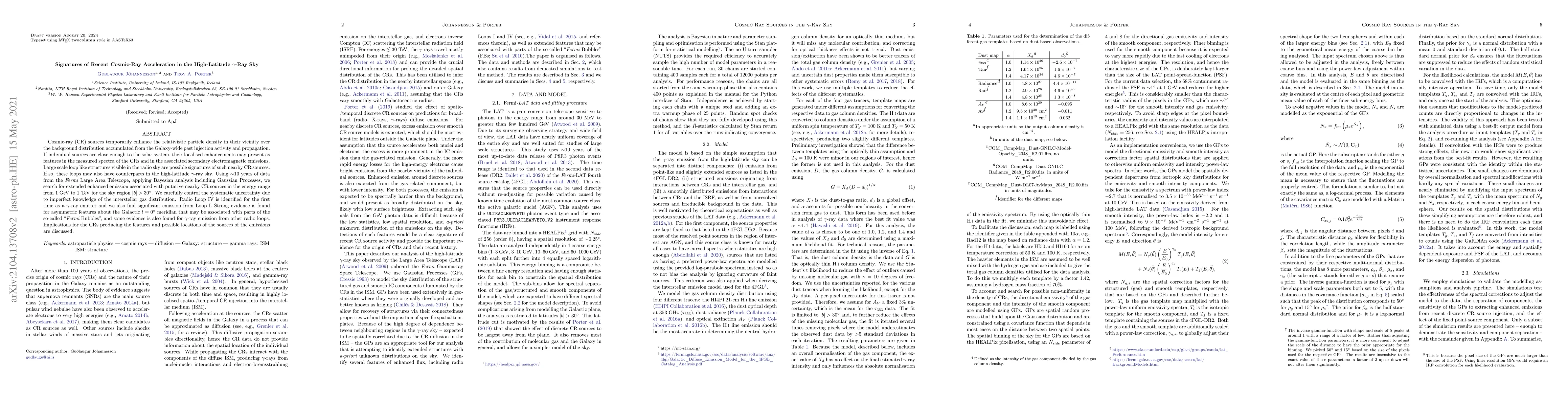 Cosmic-ray (CR) sources temporarily enhance the relativistic particle density in their vicinity over the background distribution accumulated from the Galaxy-wide past injection activity and propagation. If individual sources are close enough to the solar system, their localised enhancements may present as features in the measured spectra of the CRs and in the associated secondary electromagnetic emissions. Large scale loop like structures visible in the radio sky are possible signatures of such nearby CR sources. If so, these loops may also have counterparts in the high-latitude $\gamma$-ray sky. Using $\sim$10 years of data from the Fermi Large Area Telescope, applying Bayesian analysis including Gaussian Processes, we search for extended enhanced emission associated with putative nearby CR sources in the energy range from 1 GeV to 1 TeV for the sky region $|b| > 30^\circ$. We carefully control the systematic uncertainty due to imperfect knowledge of the interstellar gas distribution. Radio Loop~IV is identified for the first time as a $\gamma$-ray emitter and we also find significant emission from Loop~I. Strong evidence is found for asymmetric features about the Galactic $l = 0^\circ$ meridian that may be associated with parts of the so-called "Fermi Bubbles", and some evidence is also found for $\gamma$-ray emission from other radio loops. Implications for the CRs producing the features and possible locations of the sources of the emissions are discussed.