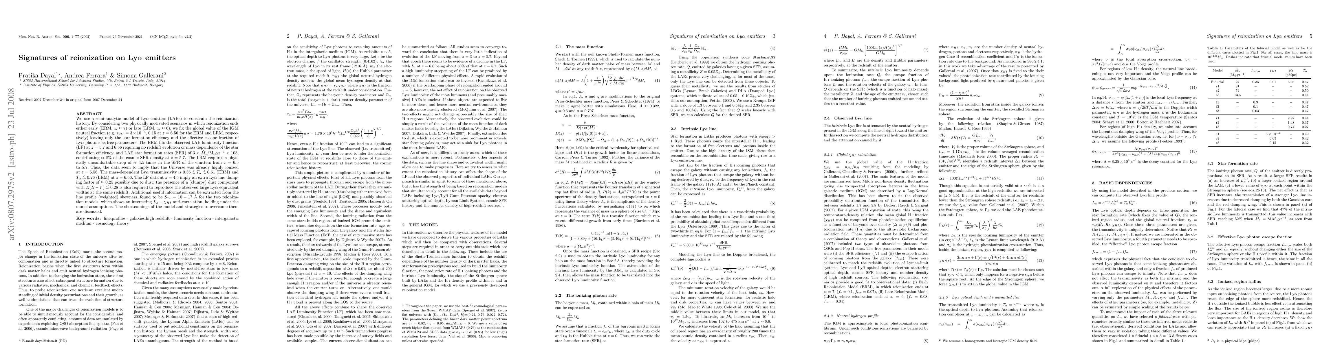 We use a semi-analytic model of Lyman alpha emitters (LAEs) to constrain the reionization history. By considering two physically motivated scenarios in which reionization ends either early (ERM, z_i ~ 7) or late (LRM, z_i ~ 6), we fix the global value of the IGM neutral fraction (e.g. chi_{HI}=3 times 10^{-4}, 0.15 at z=6.56 for the ERM and LRM, respectively) leaving only the star formation efficiency and the effective escape fraction of Lya photons as free parameters. The ERM fits the observed LAE luminosity function (LF) at z=5.7 and 6.56 requiring no redshift evolution or mass dependence of the star formation efficiency, and LAE star formation rates (SFR) of 3-103 solar masses/year, contributing approximately 8% of the cosmic SFR density at z=5.7. The LRM requires a physically uncomfortable drop of approximately 4.5 times in the SFR of the emitters from z=6.5 to 5.7. Thus, the data seem to imply that the Universe was already highly ionized at z=6.56. The mass-dependent Lya transmissivity is between 0.36-0.51 (ERM) and less than 0.26 (LRM) at z=6.56. The LF data at z=4.5 imply an extra Lya line damping factor of approximately 0.25 possibly due to dust; the presence of a (clumpy) dust component with E(B-V) ~ 0.28 is also required to reproduce the observed large Lya equivalent widths at the same redshift. Additional useful information can be extracted from the line profile (weighted) skewness, found to be S_W=10-17 Angstrom for the two reionization models, which shows an interesting L_alpha-chi_{HI} anti-correlation, holding under the model assumptions. The shortcomings of the model and strategies to overcome them are discussed.