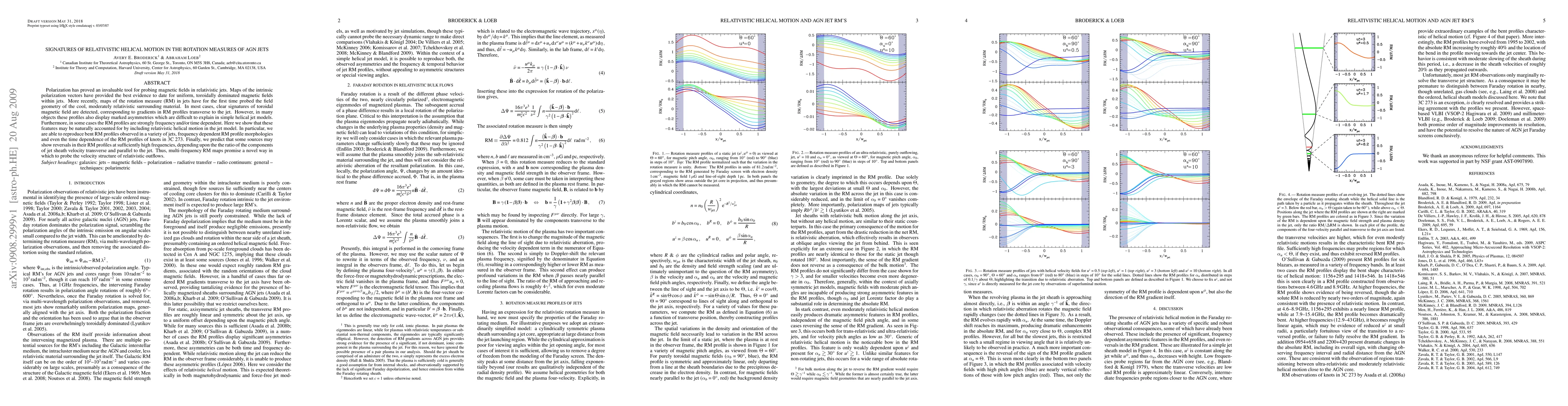 This paper investigates the rotation measures (RM) in AGN jets to reveal signatures of relativistic helical motion, explaining asymmetries and frequency/time dependencies in RM profiles through such motion. It suggests that multi-frequency RM maps can provide insights into the velocity structure of relativistic outflows.