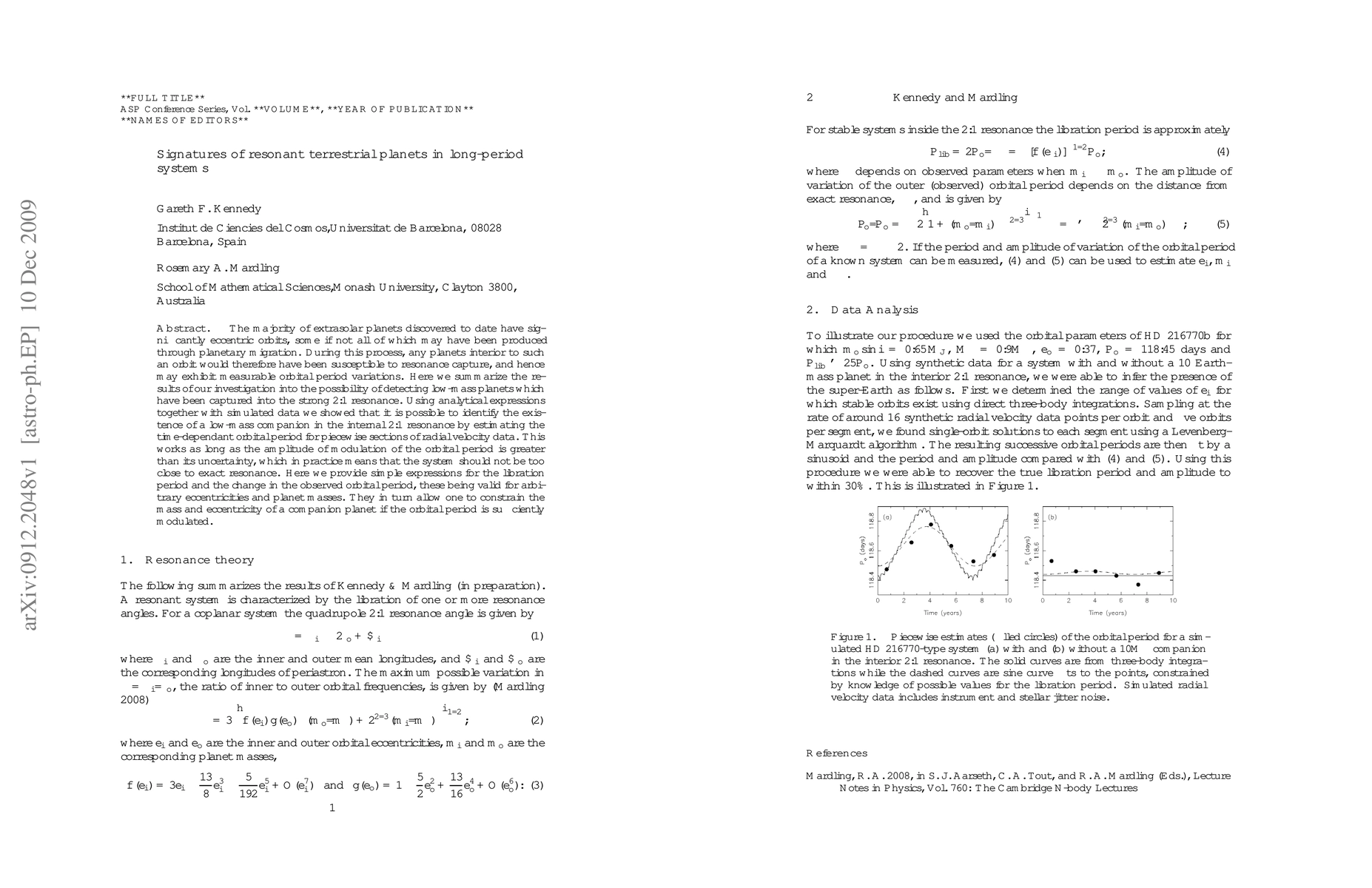 The majority of extrasolar planets discovered to date have significantly eccentric orbits, some if not all of which may have been produced through planetary migration. During this process, any planets interior to such an orbit would therefore have been susceptible to resonance capture, and hence may exhibit measurable orbital period variations. Here we summarize the results of our investigation into the possibility of detecting low-mass planets which have been captured into the strong 2:1 resonance. Using analytical expressions together with simulated data we showed that it is possible to identify the existence of a low-mass companion in the internal 2:1 resonance by estimating the time-dependant orbital period for piecewise sections of radial velocity data. This works as long as the amplitude of modulation of the orbital period is greater than its uncertainty, which in practice means that the system should not be too close to exact resonance. Here we provide simple expressions for the libration period and the change in the observed orbital period, these being valid for arbitrary eccentricities and planet masses. They in turn allow one to constrain the mass and eccentricity of a companion planet if the orbital period is sufficiently modulated.