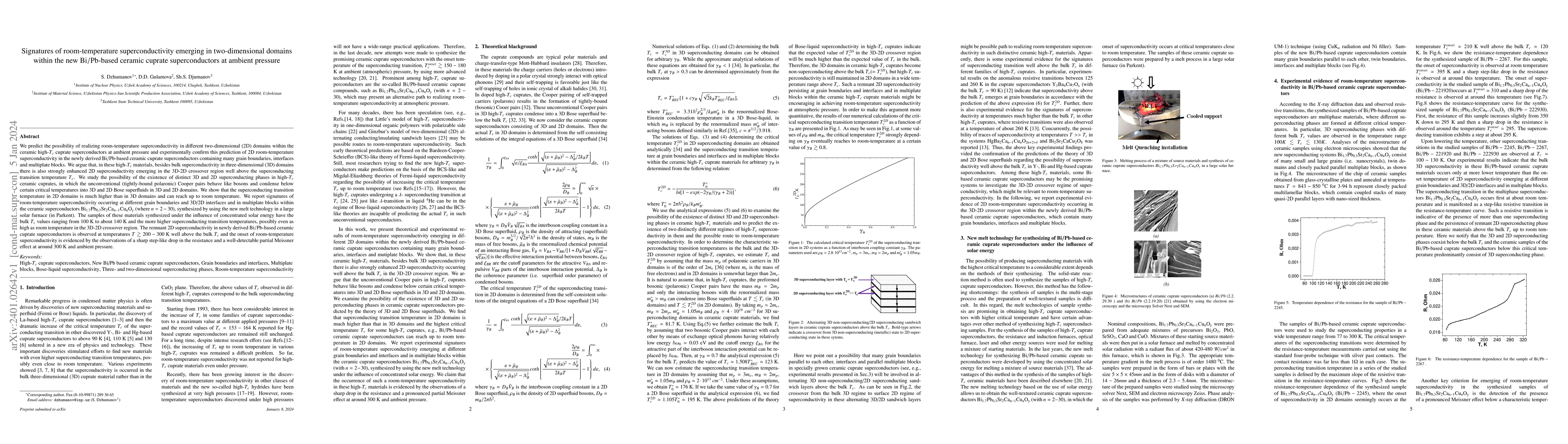 This research predicts and experimentally confirms the emergence of room-temperature superconductivity in two-dimensional domains within new Bi/Pb-based ceramic cuprate superconductors, showing that 2D superconductivity can occur well above the bulk transition temperature, potentially reaching room temperature.
