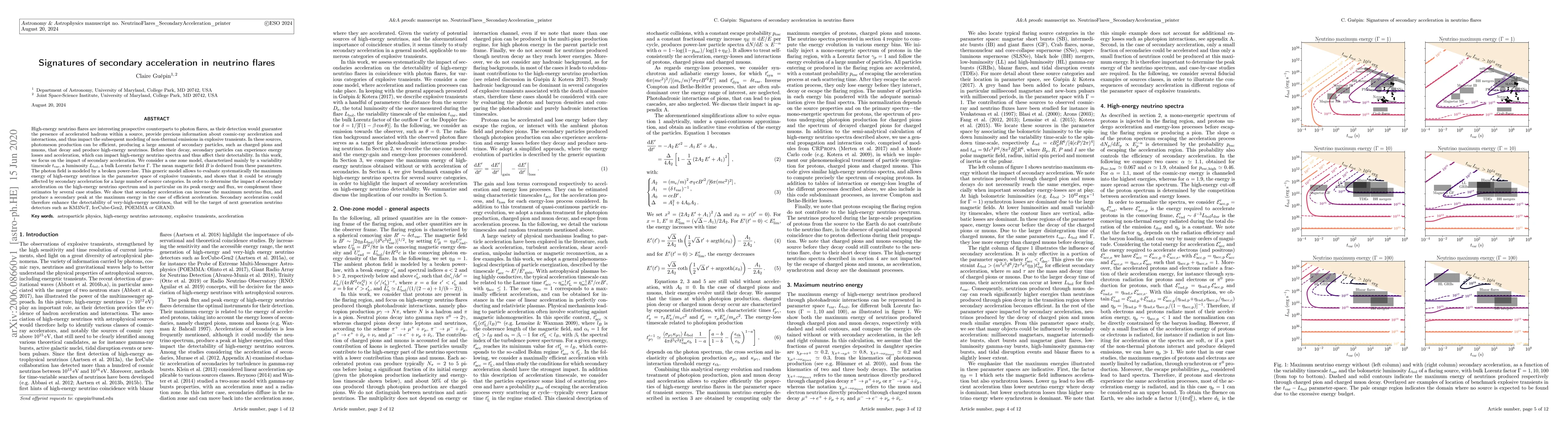 This paper investigates how secondary acceleration in neutrino flares affects high-energy neutrino spectra, showing that it can significantly alter the peak energy and flux. The study uses a one-zone model to demonstrate that secondary acceleration can enhance the detectability of very-high-energy neutrinos, which is crucial for next-generation neutrino detectors.