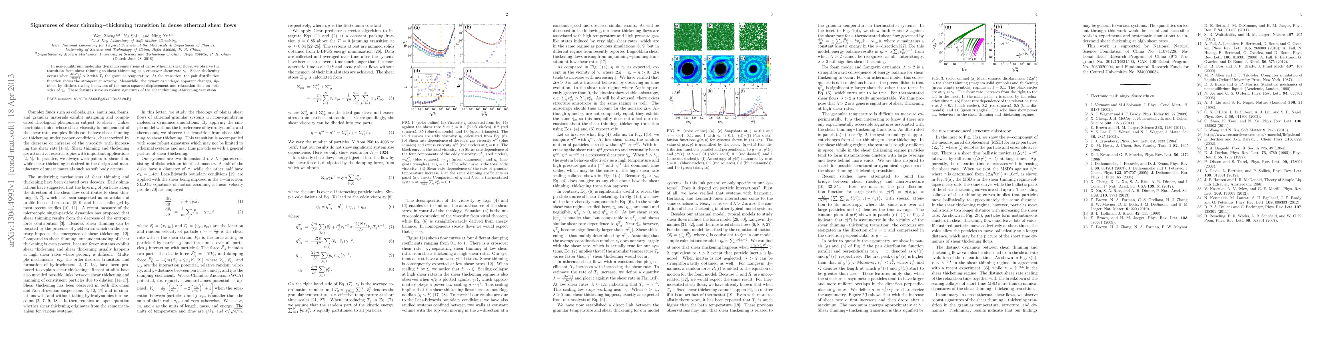 In non-equilibrium molecular dynamics simulations of dense athermal shear flows, we observe the transition from shear thinning to shear thickening at a crossover shear rate $\dot\gamma_c$. Shear thickening occurs when $\frac{{\rm d (ln} T_g)}{{\rm d (ln}\dot\gamma)}>2$ with $T_g$ the granular temperature. At the transition, the pair distribution function shows the strongest anisotropy. Meanwhile, the dynamics undergo apparent changes, signified by distinct scaling behaviors of the mean squared displacement and relaxation time on both sides of $\dot\gamma_c$. These features serve as robust signatures of the shear thinning-thickening transition.