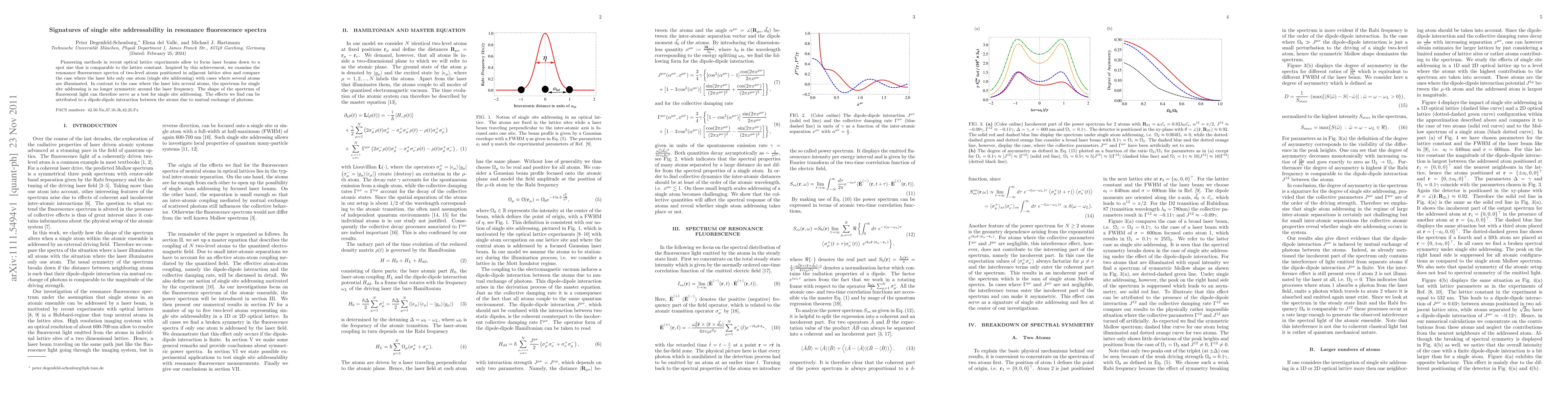 Pioneering methods in recent optical lattice experiments allow to focus laser beams down to a spot size that is comparable to the lattice constant. Inspired by this achievement, we examine the resonance fluorescence spectra of two-level atoms positioned in adjacent lattice sites and compare the case where the laser hits only one atom (single site addressing) with cases where several atoms are illuminated. In contrast to the case where the laser hits several atoms, the spectrum for single site addressing is no longer symmetric around the laser frequency. The shape of the spectrum of fluorescent light can therefore serve as a test for single site addressing. The effects we find can be attributed to a dipole-dipole interaction between the atoms due to mutual exchange of photons.