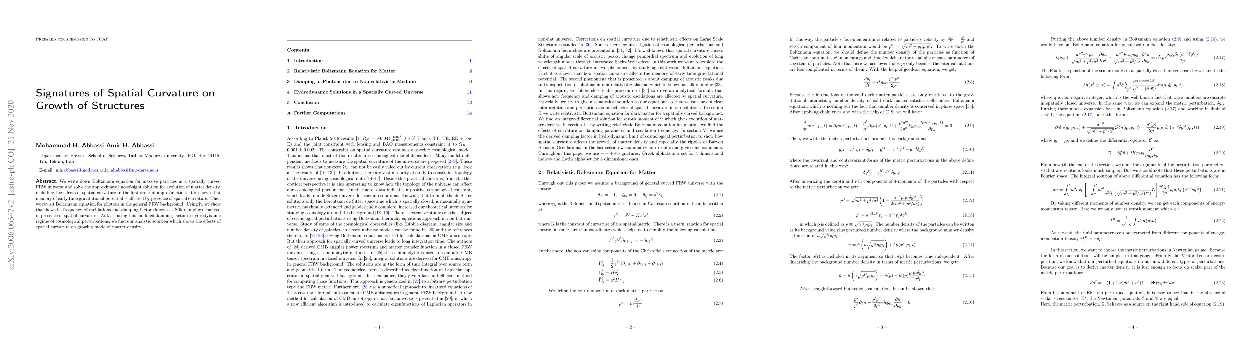 We write down Boltzmann equation for massive particles in a spatially curved FRW universe and solve the approximate line-of-sight solution for evolution of matter density, including the effects of spatial curvature to the first order of approximation. It is shown that memory of early time gravitational potential is affected by presence of spatial curvature. Then we revisit Boltzmann equation for photons in the general FRW background. Using it, we show that how the frequency of oscillations and damping factor (known as Silk damping) changed in presence of spatial curvature. At last, using this modified damping factor in hydrodynamic regime of cosmological perturbations, we find our analytic solution which shows the effects of spatial curvature on growing mode of matter density.