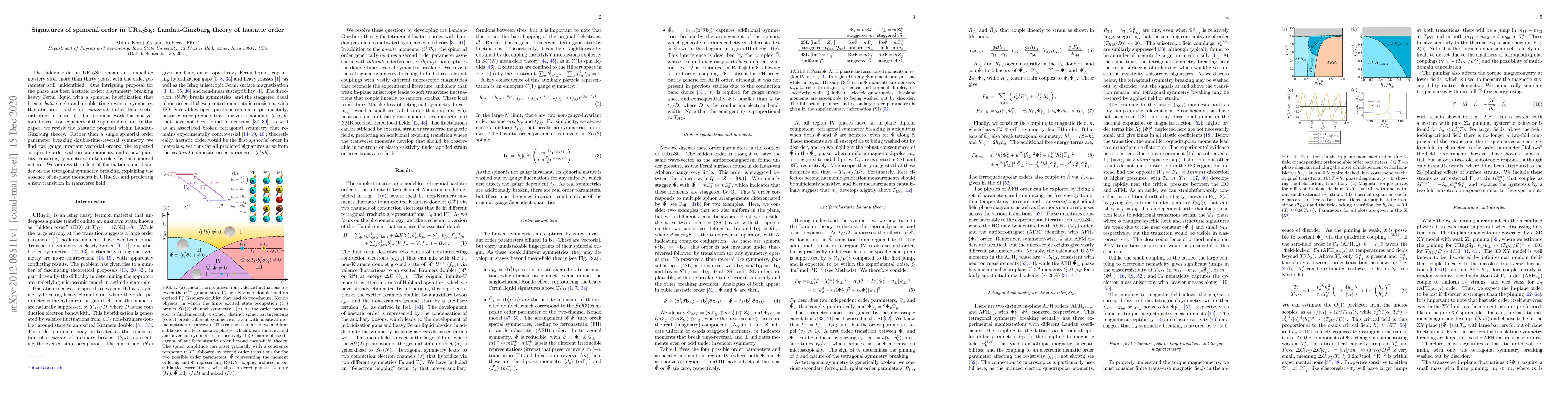 This paper explores the hidden order in URu$_2$Si$_2$ through the lens of hastatic order, proposing two gauge-invariant vectorial orders within Landau-Ginzburg theory that capture the spinorial nature of the order, and explains the absence of in-plane moments and predicts a new transition in transverse field.