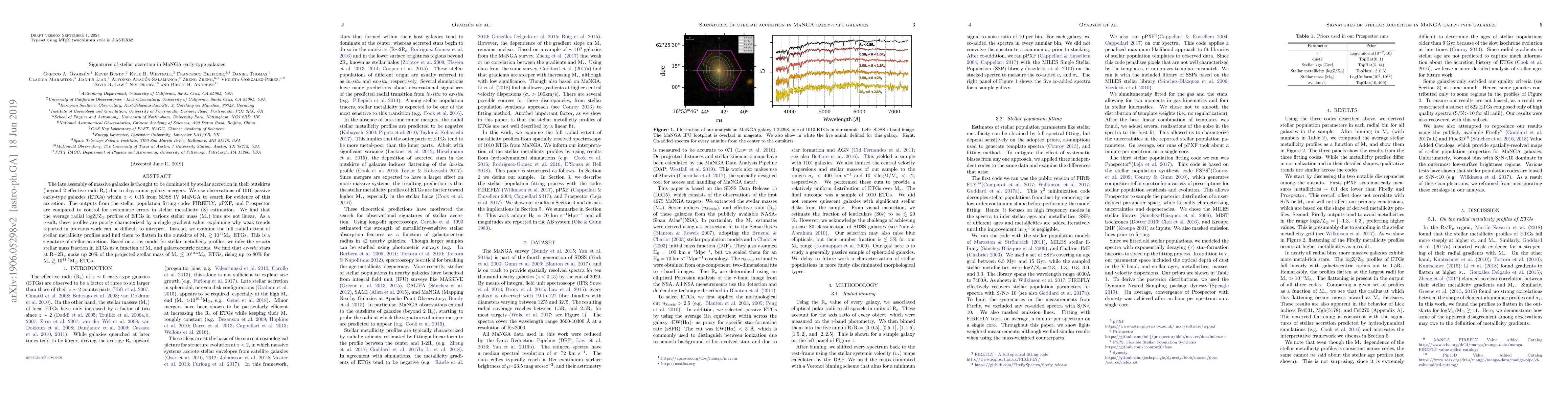 The late assembly of massive galaxies is thought to be dominated by stellar accretion in their outskirts (beyond 2 effective radii Re) due to dry, minor galaxy mergers. We use observations of 1010 passive early-type galaxies (ETGs) within z<0.15 from SDSS IV MaNGA to search for evidence of this accretion. The outputs from the stellar population fitting codes FIREFLY, pPXF, and Prospector are compared to control for systematic errors in stellar metallicity (Z) estimation. We find that the average radial logZ/Zsun profiles of ETGs in various stellar mass (M) bins are not linear. As a result, these profiles are poorly characterized by a single gradient value, explaining why weak trends reported in previous work can be difficult to interpret. Instead, we examine the full radial extent of stellar metallicity profiles and find them to flatten in the outskirts of M>10^{11}Msun ETGs. This is a signature of stellar accretion. Based on a toy model for stellar metallicity profiles, we infer the ex-situ stellar mass fraction in ETGs as a function of M and galactocentric radius. We find that ex-situ stars at 2Re make up 20% of the projected stellar mass of M<10^{10.5}Msun ETGs, rising up to 80% for M>10^{11.5}Msun ETGs.