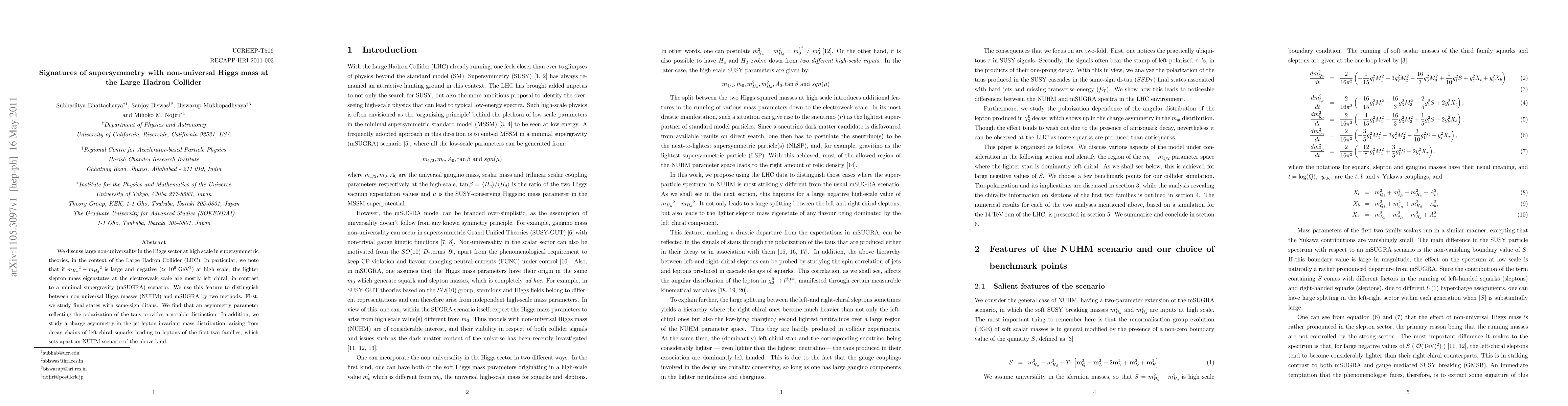 We discuss large non-universality in the Higgs sector at high scale in supersymmetric theories, in the context of the Large Hadron Collider (LHC). In particular, we note that if ${m_{H_u}}^2-{m_{H_d}}^2$ is large and negative ($\simeq 10^6 {\rm ~GeV^2}$) at high scale, the lighter slepton mass eigenstates at the electroweak scale are mostly left chiral, in contrast to a minimal supergravity (mSUGRA) scenario. We use this feature to distinguish between non-universal Higgs masses (NUHM) and mSUGRA by two methods. First, we study final states with same-sign ditaus. We find that an asymmetry parameter reflecting the polarization of the taus provides a notable distinction. In addition, we study a charge asymmetry in the jet-lepton invariant mass distribution, arising from decay chains of left-chiral squarks leading to leptons of the first two families, which sets apart an NUHM scenario of the above kind.