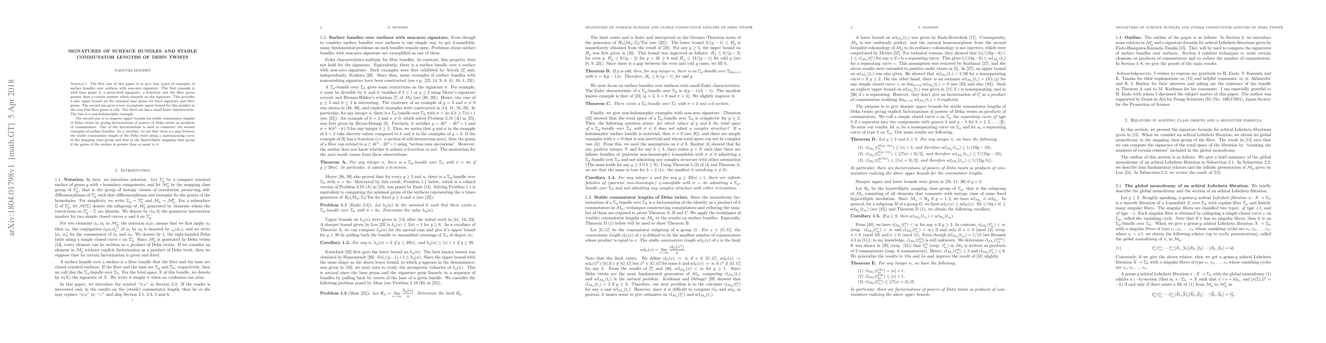 This paper presents four examples of surface bundles with non-zero signatures, improving upper bounds on minimal base genus and fiber genus. It also refines upper bounds for stable commutator lengths of Dehn twists through factorizations, showing a gap in lengths between certain mapping class groups.