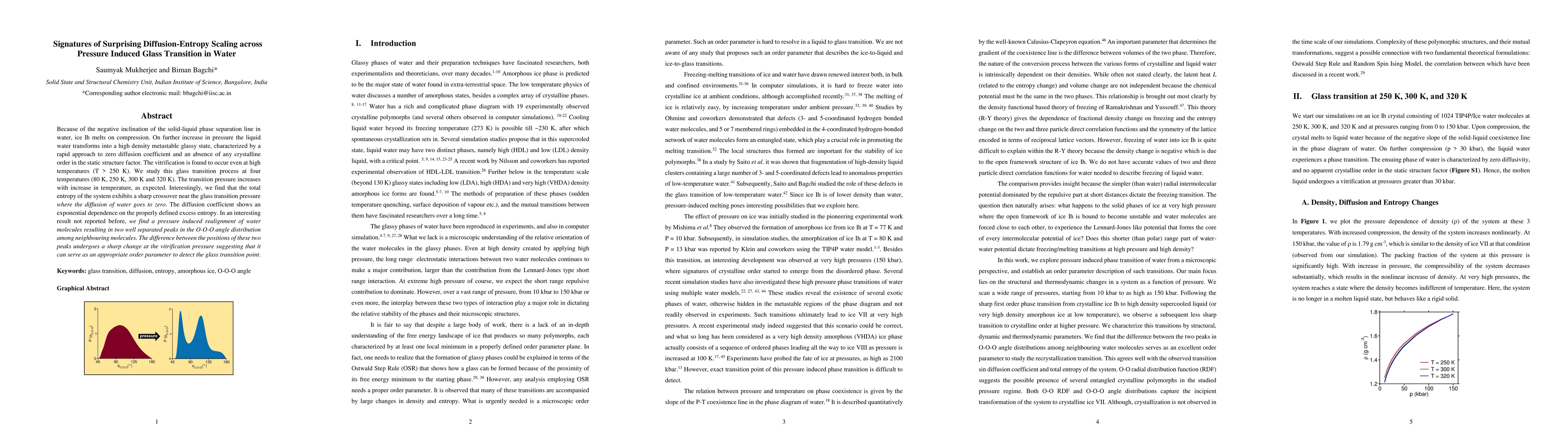 This study investigates the pressure-induced glass transition in water, revealing a surprising diffusion-entropy scaling near the transition pressure. The research identifies a realignment of water molecules and a distinct entropy crossover, suggesting a new order parameter for detecting the glass transition.
