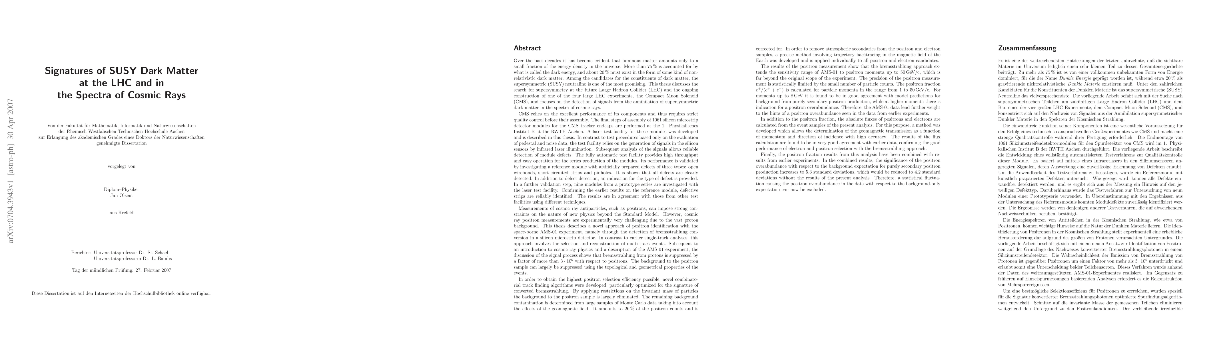 This thesis discusses the search for supersymmetry at the future Large Hadron Collider (LHC) and the ongoing construction of one of the four large LHC experiments, the Compact Muon Solenoid (CMS), and focuses on the detection of signals from the annihilation of supersymmetric dark matter in the spectra of cosmic rays. Measurements of cosmic ray antiparticles, such as positrons, can impose strong constraints on the nature of new physics beyond the Standard Model. However, cosmic ray positron measurements are experimentally very challenging due to the vast proton background. A novel approach of positron identification with the space-borne AMS-01 experiment, namely through the detection of bremsstrahlung conversion in a silicon microstrip detector, is introduced. Bremsstrahlung from protons is suppressed by a factor of more than 3*10^6 with respect to positrons. The results of the positron measurement show that the bremsstrahlung approach extends the sensitivity range of AMS-01 to positron momenta up to 50 GeV/c, which is far beyond the original scope of the experiment. At momenta above 8 GeV/c there is indication for a positron overabundance with respect to model predictions for purely secondary positron production. Therefore, the AMS-01 data lend further weight to the hints of a positron overabundance seen in the data from earlier experiments. The positron fraction measurements from the most recent experiments are combined with the results of this analysis, giving the most precise positron fraction data yet available.