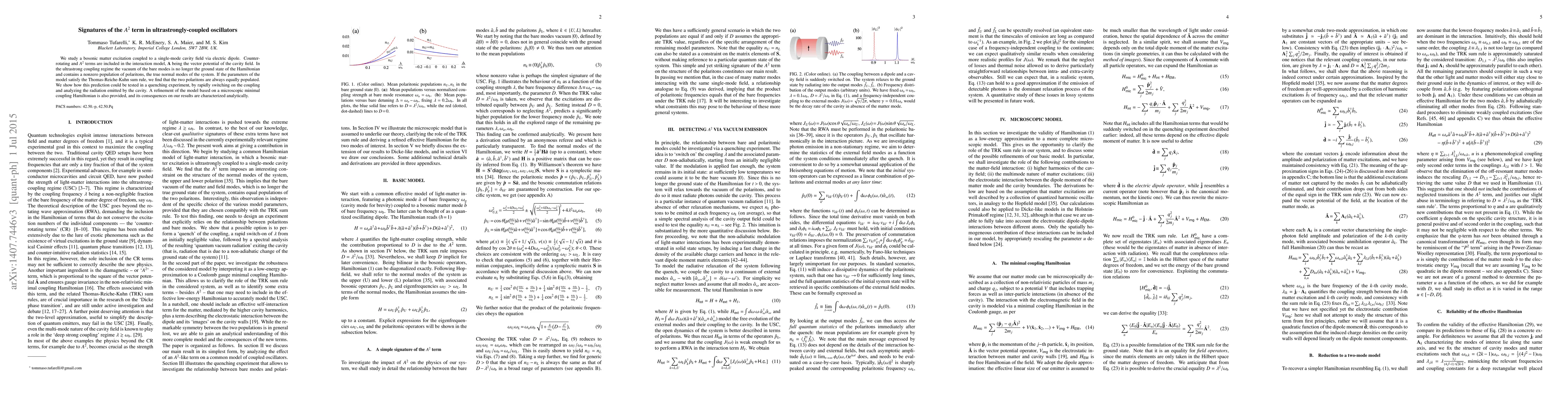 We study a bosonic matter excitation coupled to a single-mode cavity field via electric dipole. Counter-rotating and $A^2$ terms are included in the interaction model, ${\mathbf A}$ being the vector potential of the cavity field. In the ultrastrong coupling regime the vacuum of the bare modes is no longer the ground state of the Hamiltonian and contains a nonzero population of polaritons, the true normal modes of the system. If the parameters of the model satisfy the Thomas-Reiche-Kuhn sum rule, we find that the two polaritons are always equally populated. We show how this prediction could be tested in a quenching experiment, by rapidly switching on the coupling and analyzing the radiation emitted by the cavity. A refinement of the model based on a microscopic minimal coupling Hamiltonian is also provided, and its consequences on our results are characterized analytically.