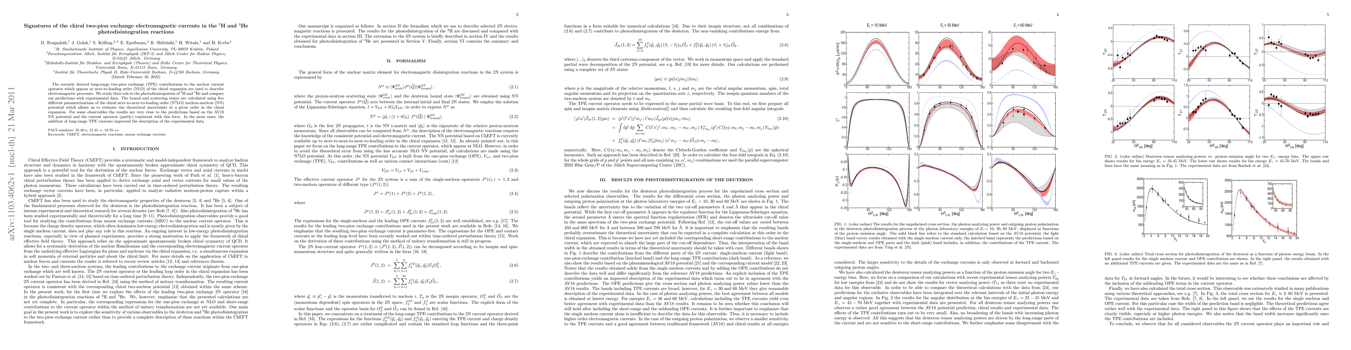 This paper investigates the impact of long-range two-pion exchange electromagnetic currents on the photodisintegration of 2H and 3He, comparing theoretical predictions with experimental data. The study finds that these currents, derived from chiral perturbation theory, often improve the description of experimental results when compared to predictions from conventional nucleon-nucleon potentials.