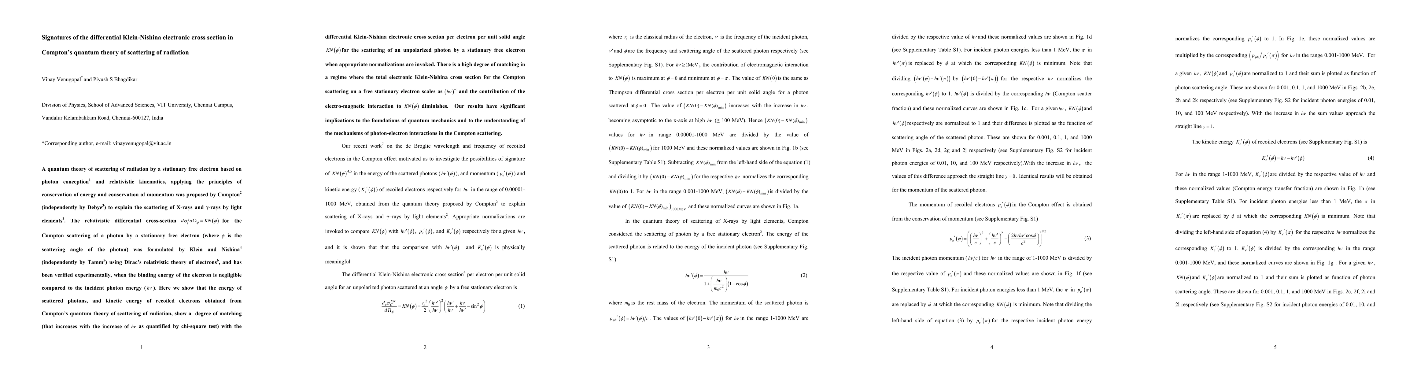 A quantum theory of scattering of radiation by a stationary free electron based on photon conception and relativistic kinematics, applying the principles of conservation of energy and conservation of momentum was proposed by Compton to explain the scattering of X-rays and {\gamma}-rays by light elements. The relativistic differential cross-section for the Compton scattering of a photon by a stationary free electron was formulated by Klein and Nishina using Dirac's relativistic theory of electrons, and has been verified experimentally, when the binding energy of the electron is negligible compared to the incident photon energy. Here we show that the energy of scattered photons, and kinetic energy of recoiled electrons obtained from Compton's quantum theory of scattering of radiation, show a degree of matching (that increases with the increase of incident photon energy as quantified by chi-square test) with the differential Klein-Nishina electronic cross section per electron per unit solid angle for the scattering of an unpolarized photon by a stationary free electron when appropriate normalizations are invoked. There is a high degree of matching in a regime where the total electronic Klein-Nishina cross section for the Compton scattering on a free stationary electron scales as the inverse of the incident photon energy and the contribution of the electro-magnetic interaction to differential electronic cross section diminishes. Our results have significant implications to the foundations of quantum mechanics and to the understanding of the mechanisms of photon-electron interactions in the Compton scattering.