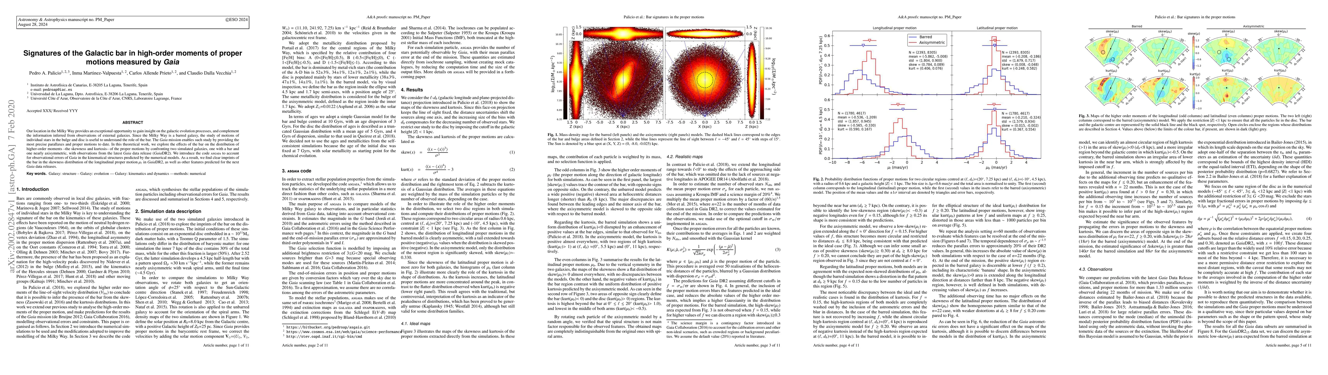 This paper investigates the influence of the Milky Way's galactic bar on the higher-order moments of proper motions using Gaia data, revealing distinct signatures in the skewness of longitudinal proper motions. The study employs the ASGAIA code to model observational errors and compares simulated barred and axisymmetric galaxies to GaiaDR2 observations.