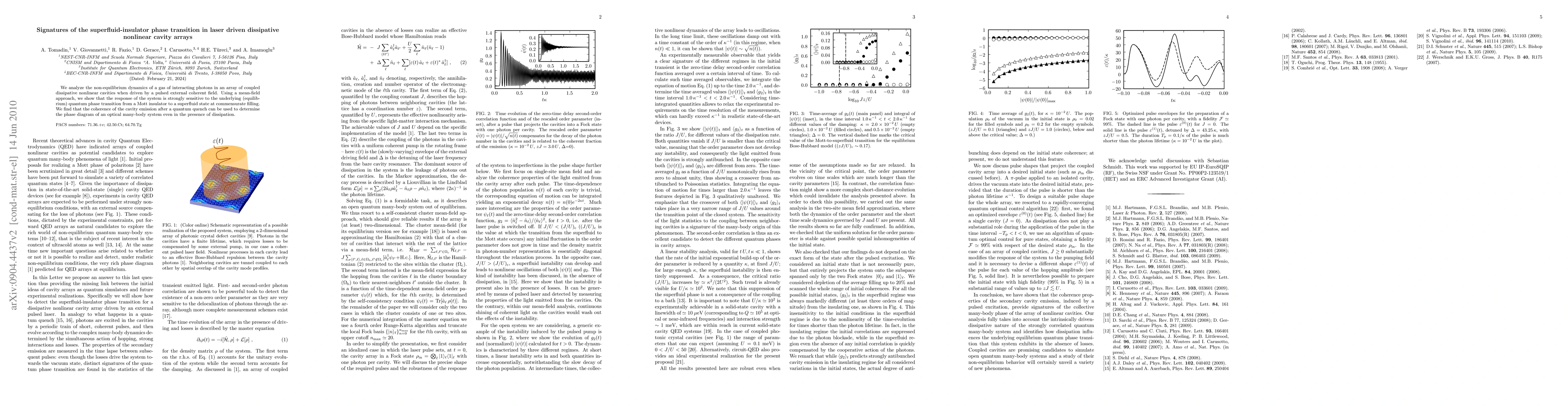 We analyze the non-equilibrium dynamics of a gas of interacting photons in an array of coupled dissipative nonlinear cavities driven by a pulsed external coherent field. Using a mean-field approach, we show that the system exhibits a phase transition from a Mott-insulator-like to a superfluid regime. For a given single-photon nonlinearity, the critical value of the photon tunneling rate at which the phase transition occurs increases with the increasing photon loss rate. We checked the robustness of the transition by showing its insensitivity to the initial state prepared by the the pulsed excitation. We find that the second-order coherence of cavity emission can be used to determine the phase diagram of an optical many-body system without the need for thermalization.