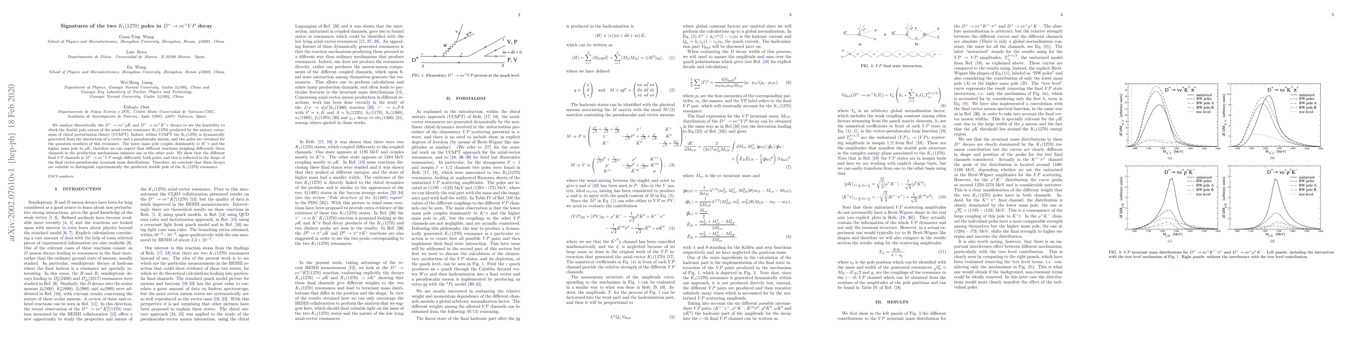 We analyze theoretically the $D^+\to \nu e^+ \rho \bar K$ and $D^+\to \nu e^+ \bar K^* \pi$ decays to see the feasibility to check the double pole nature of the axial-vector resonance $K_1(1270)$ predicted by the unitary extensions of chiral perturbation theory (UChPT). Indeed, within UChPT the $K_1(1270)$ is dynamically generated from the interaction of a vector and a pseudoscalar meson, and two poles are obtained for the quantum numbers of this resonance. The lower mass pole couples dominantly to $K^*\pi$ and the higher mass pole to $\rho K$, therefore we can expect that different reactions weighing differently these channels in the production mechanisms enhance one or the other pole. We show that the different final $VP$ channels in $D^+\to \nu e^+ V P$ weigh differently both poles, and this is reflected in the shape of the final vector-pseudoscalar invariant mass distributions. Therefore, we conclude that these decays are suitable to distinguish experimentally the predicted double pole of the $K_1(1270)$ resonance.