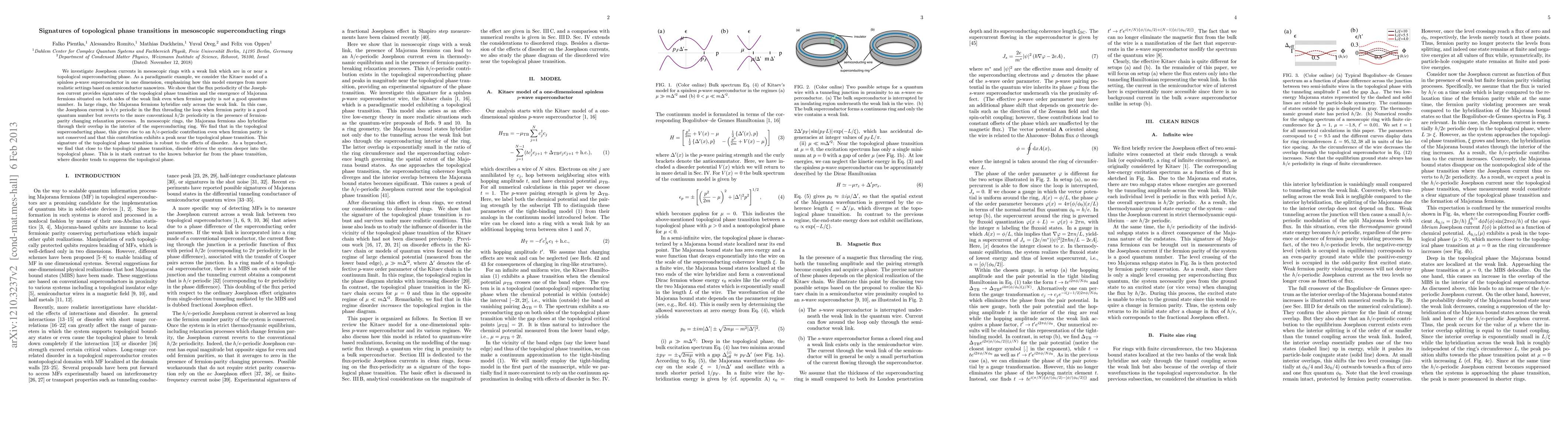 This paper investigates Josephson currents in mesoscopic superconducting rings, revealing signatures of topological phase transitions through flux periodicity. It finds an h/e-periodic Josephson current in topological phases, with peaks near the transition, robust against disorder, and showing that disorder can enhance topological properties near the transition.