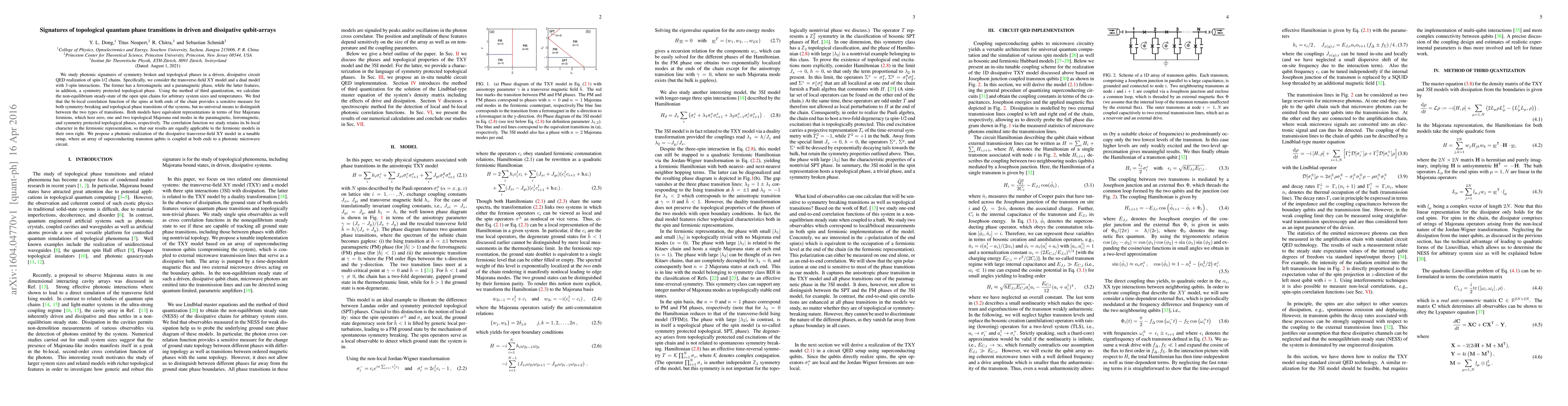 This paper investigates photonic signatures of symmetry-breaking and topological phase transitions in driven, dissipative qubit arrays modeled by the transverse-field XY model and a dual model with 3-spin interactions. The bi-local correlation function of spins at the chain's ends is identified as a sensitive measure for these transitions, though it cannot universally distinguish between them.