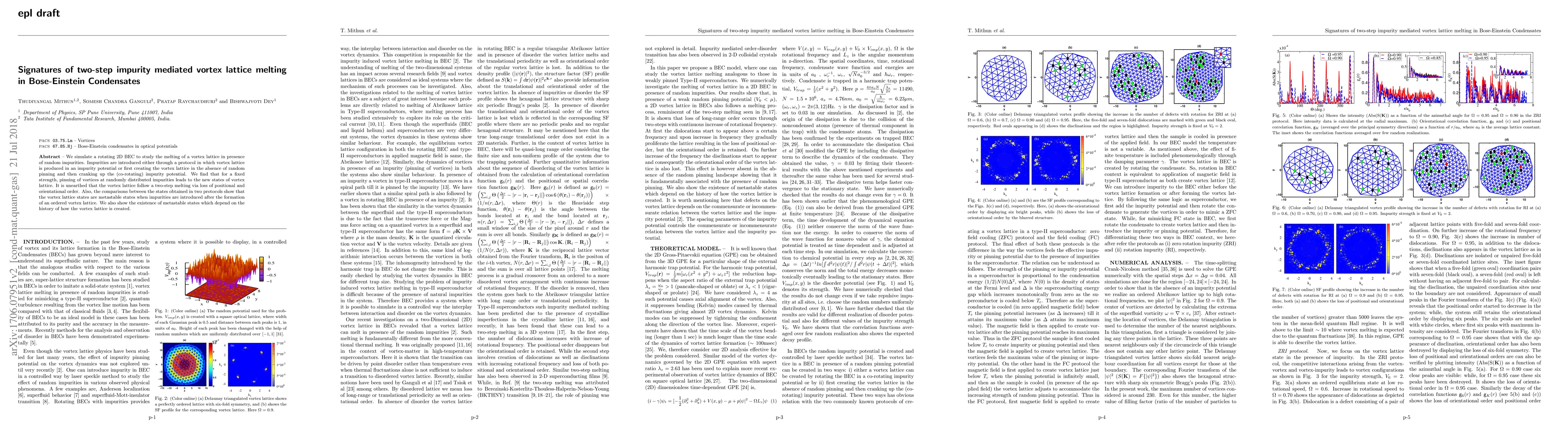 We simulate a rotating 2D BEC to study the melting of a vortex lattice in presence of random impurities. Impurities are introduced either through a protocol in which vortex lattice is produced in an impurity potential or first creating the vortex lattice in the absence of random pinning and then cranking up the (co-rotating) impurity potential. We find that for a fixed strength, pinning of vortices at randomly distributed impurities leads to the new states of vortex lattice. It is unearthed that the vortex lattice follow a two-step melting via loss of positional and orientational order. Also, the comparisons between the states obtained in two protocols show that the vortex lattice states are metastable states when impurities are introduced after the formation of an ordered vortex lattice. We also show the existence of metastable states which depend on the history of how the vortex lattice is created.