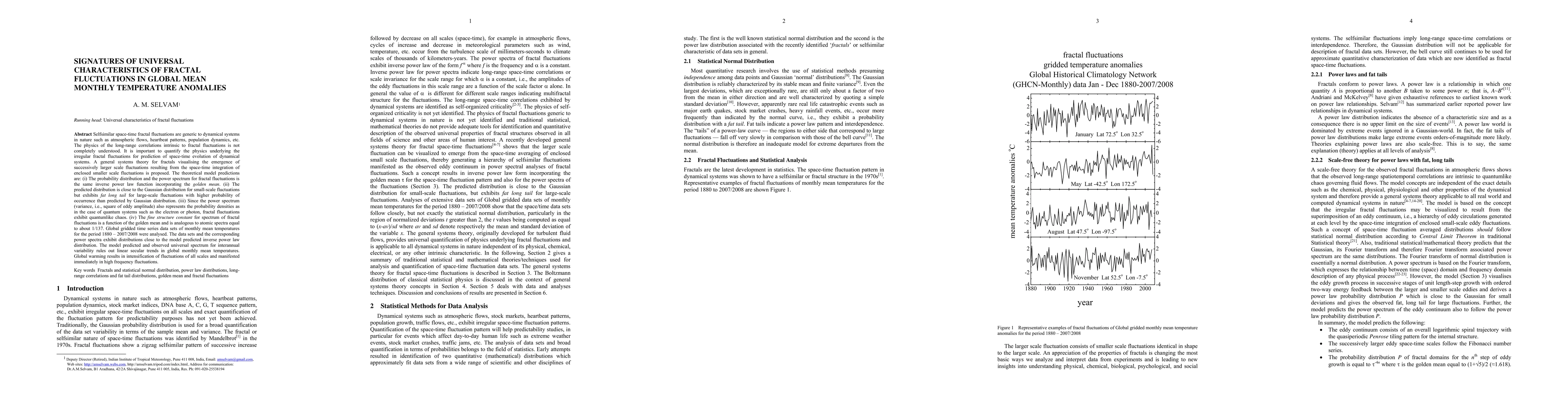 Selfsimilar space-time fractal fluctuations are generic to dynamical systems in nature such as atmospheric flows, heartbeat patterns, population dynamics, etc. The physics of the long-range correlations intrinsic to fractal fluctuations is not yet identified. It is important to quantify the physics underlying the irregular fractal fluctuations for predictability studies. A general systems theory for fractals visualizes the emergence of successively larger scale fluctuations to result from the space-time integration of enclosed smaller scale fluctuations. The model predictions are as follows. The probability distribution and the power spectrum for fractal fluctuations is the same inverse power law function incorporating the golden mean. The predicted distribution is close to the Gaussian distribution for small-scale fluctuations but exhibits fat long tail for large-scale fluctuations with higher probability of occurrence than predicted by Gaussian distribution. Since the power (variance i.e. square of eddy amplitude) spectrum also represents the probability densities as in the case of quantum systems such as the electron or photon, fractal fluctuations exhibit quantumlike chaos. The fine structure constant for spectrum of fractal fluctuations is a function of the golden mean and is analogous to atomic spectra equal to about 1/137. Global gridded time series data sets of monthly mean temperatures for the period 1880 - 2007/2008 are analysed to show that data sets and corresponding power spectra exhibit distributions close to the model predicted inverse power law distribution. The model predicted and observed universal spectrum for interannual variability rules out linear secular trends in global monthly mean temperatures. Global warming results in intensification of fluctuations of all scales and manifested immediately in high frequency fluctuations.