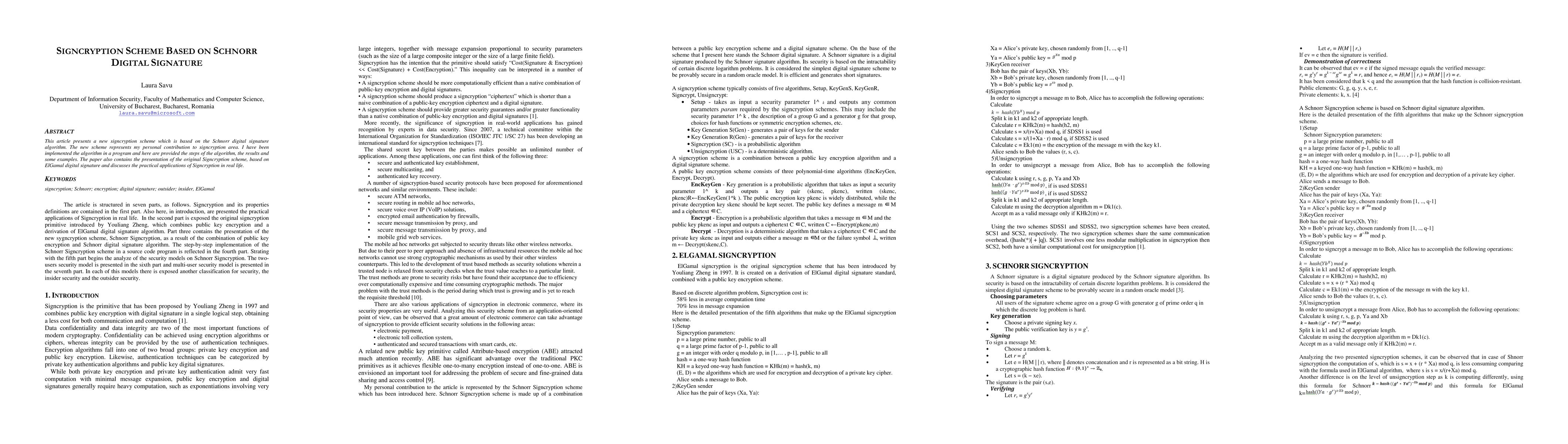 This paper introduces a novel signcryption scheme based on the Schnorr digital signature algorithm, implementing it in a program and providing detailed steps, results, and examples. It also reviews the original ElGamal-based signcryption scheme and discusses its practical applications in real-life scenarios.