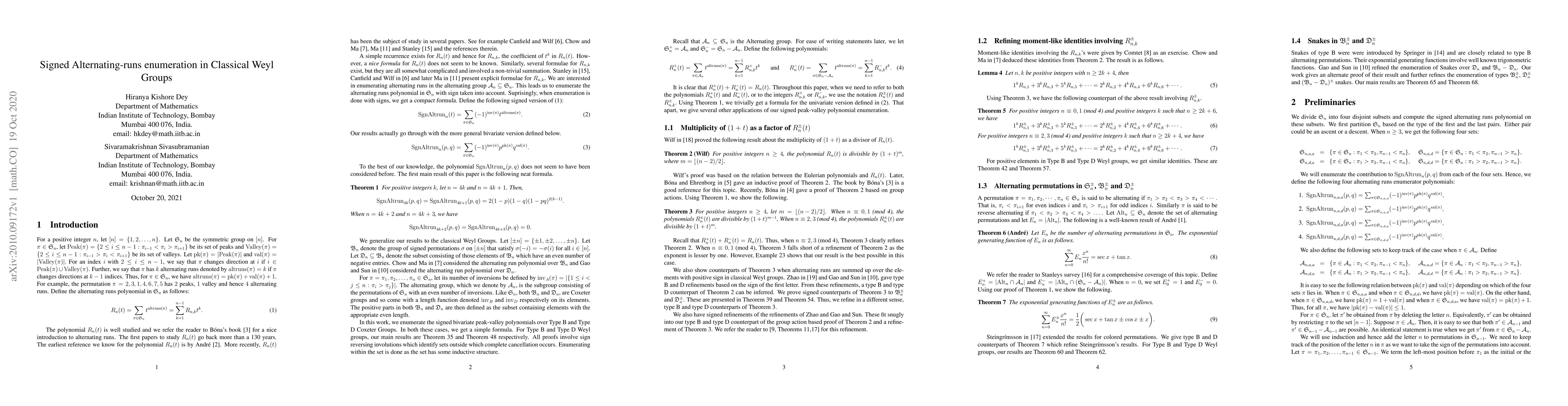 The alternating-runs polynomial enumerates alternating runs in the symmetric group. There are three formulae for the number of permutations, $R_{n,k}$ in $\mathfrak{S}_n$ with $k$ alternating runs, but all of them are complicated. We show that when enumerated with sign taken into account, one gets a {\it neat formula}. As a consequence, we get a near refinement of a result of Wilf on the exponent of $(1+t)$ when it divides the alternating-runs polynomial in the alternating group $\mathcal{A}_n$. Other applications include a moment-type identity and enumeration of alternating permutations in $\mathcal{A}_n$. Similar results are obtained for the type B and type D Coxeter groups.