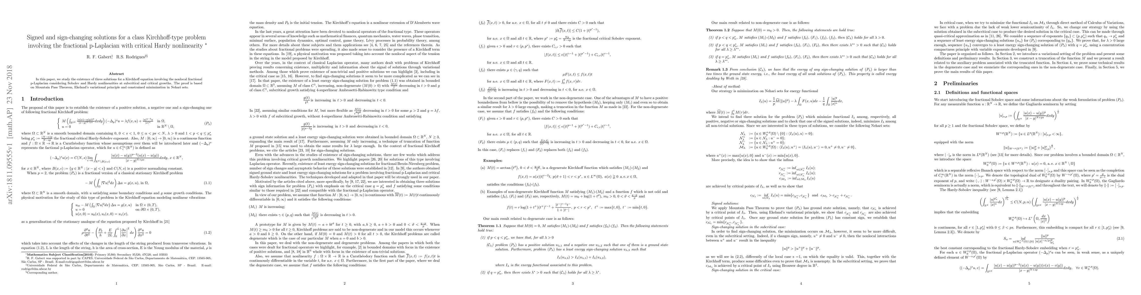 In this paper, we study the existence of three solutions for a Kirchhoff equation involving the nonlocal fractional p-Laplacian considering Sobolev and Hardy nonlinearities at subcritical and critical growths. The proof is based on Mountain Pass Theorem, Ekeland's variational principle and constrained minimization in Nehari sets.