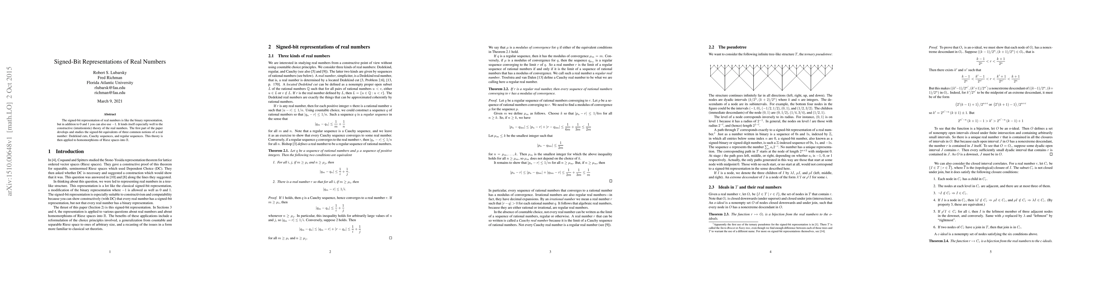 The signed-bit representation of real numbers is like the binary representation, but in addition to 0 and 1 you can also use -1. It lends itself especially well to the constructive (intuitionistic) theory of the real numbers. The first part of the paper develops and studies the signed-bit equivalents of three common notions of a real number: Dedekind cuts, Cauchy sequences, and regular sequences. This theory is then applied to homomorphisms of Riesz spaces into the reals.