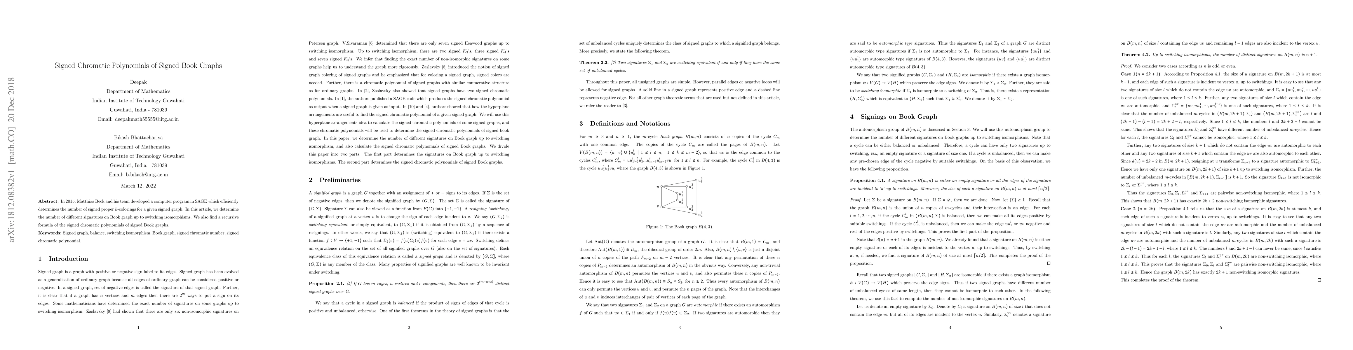 This paper investigates the signed chromatic polynomials of signed Book graphs, deriving a recursive formula and determining the number of distinct signatures on such graphs up to switching isomorphisms, using a SAGE program developed by Matthias Beck.