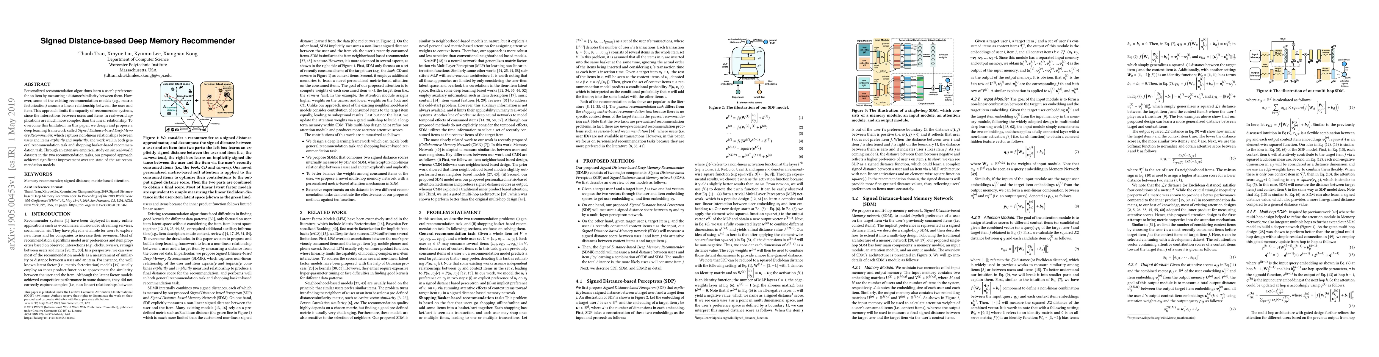 A new deep learning framework called Signed Distance-based Deep Memory Recommender is proposed to overcome limitations of existing recommendation models by capturing non-linear relationships between users and items. It outperforms 10 state-of-the-art models in two recommendation tasks on six real-world datasets.