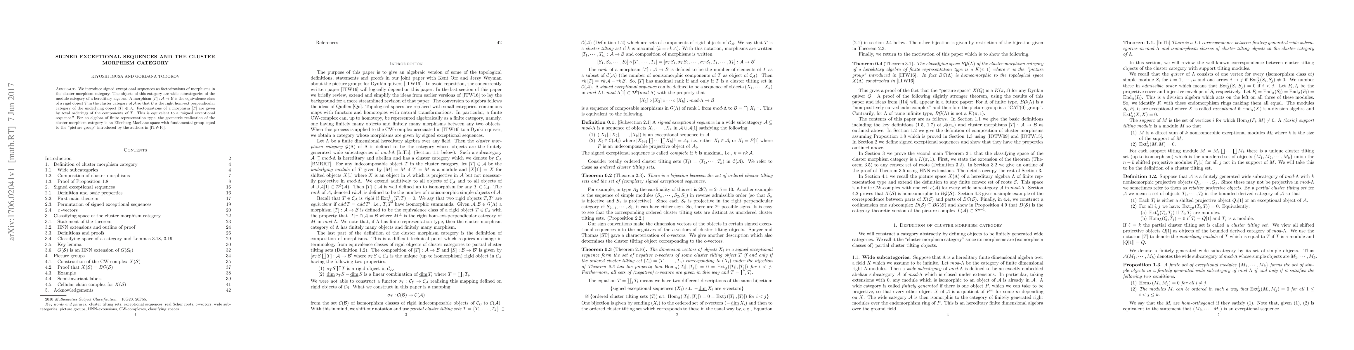 The paper introduces signed exceptional sequences as factorizations of morphisms in the cluster morphism category, where objects are wide subcategories of a hereditary algebra's module category. It establishes that these sequences correspond to the ordering of components in rigid objects, leading to an Eilenberg-MacLane space with a fundamental group equal to the picture group for algebras of finite representation type.