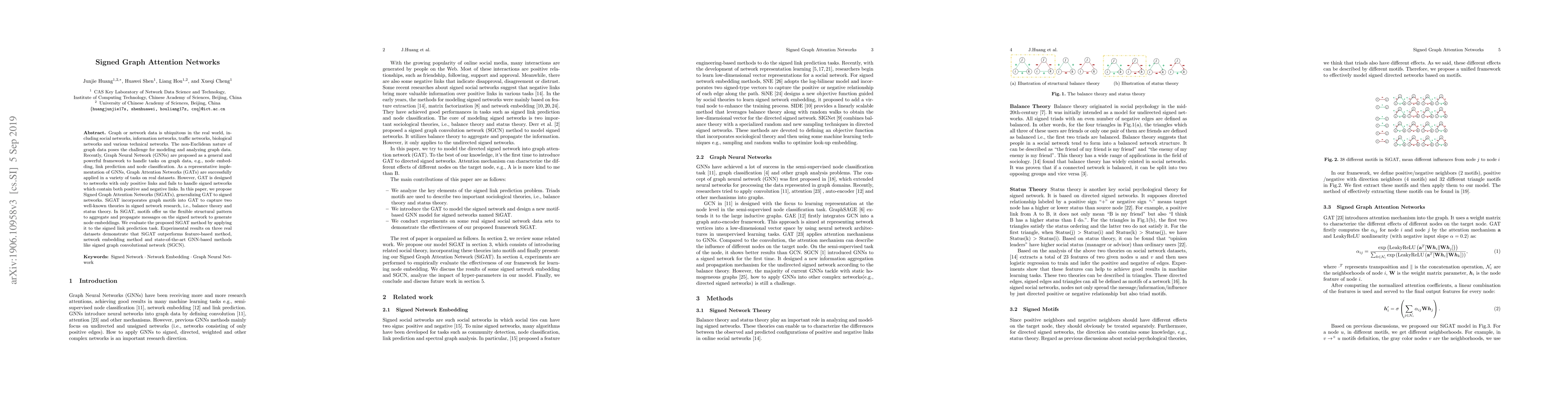 This paper proposes Signed Graph Attention Networks (SiGATs) to handle signed graph data, which contain both positive and negative links. SiGAT generalizes Graph Attention Networks (GATs) by incorporating graph motifs to capture balance and status theories, achieving better performance in signed link prediction compared to existing methods.