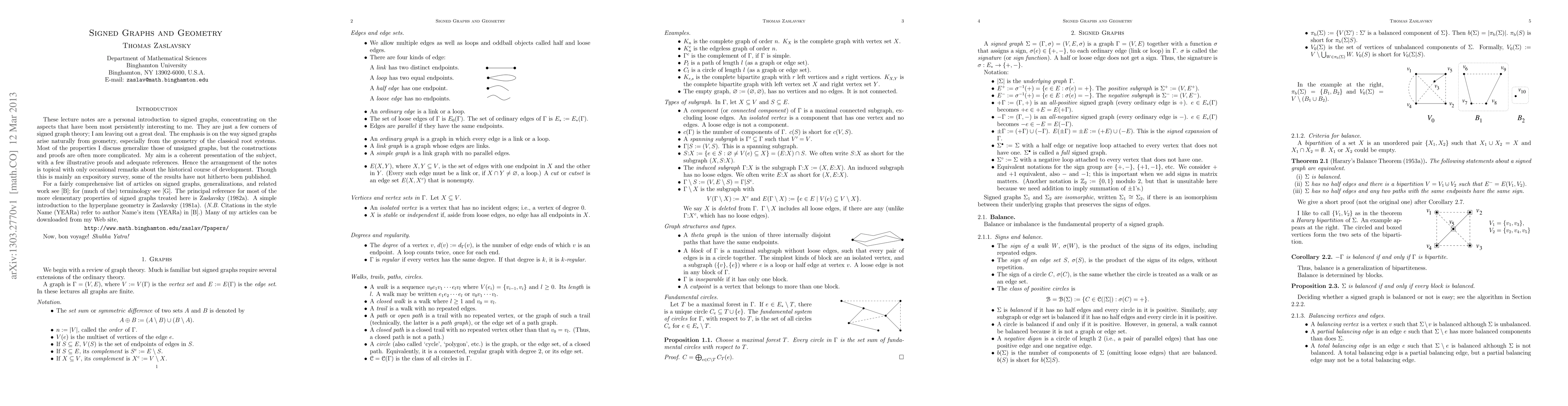These lecture notes are a personal introduction to signed graphs, concentrating on the aspects that have been most persistently interesting to me. They are just a few corners of signed graph theory; I am leaving out a great deal. The emphasis is on the way signed graphs arise naturally from geometry, especially from the geometry of the classical root systems. Most of the properties I discuss generalize those of unsigned graphs, but the constructions and proofs are often more complicated. My aim is a coherent presentation of the subject, with a few illustrative proofs and adequate references. Hence the arrangement of the notes is topical with only occasional remarks about the historical course of development. Though this is mainly an expository survey, some of the results have not hitherto been published.