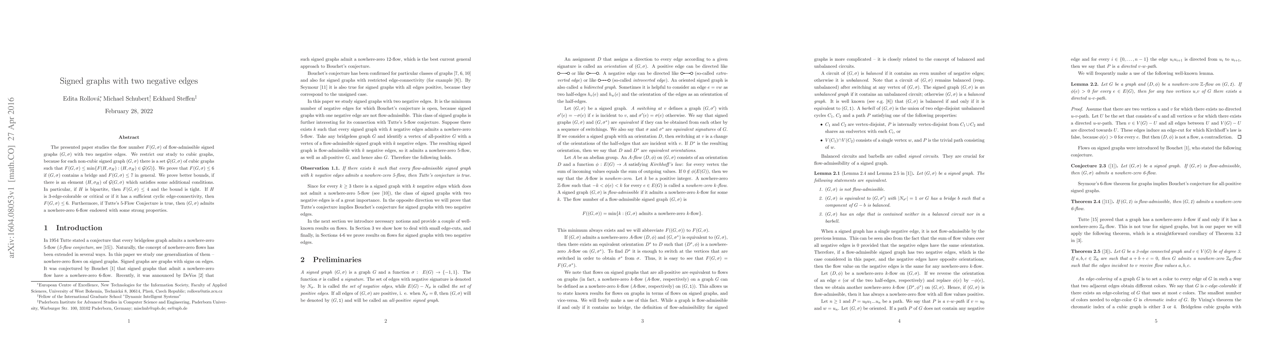 This research paper studies the flow number of signed graphs with two negative edges, finding that it is at most 7 in general, but can be improved to 4 for bipartite graphs and up to 6 for other specific cases.