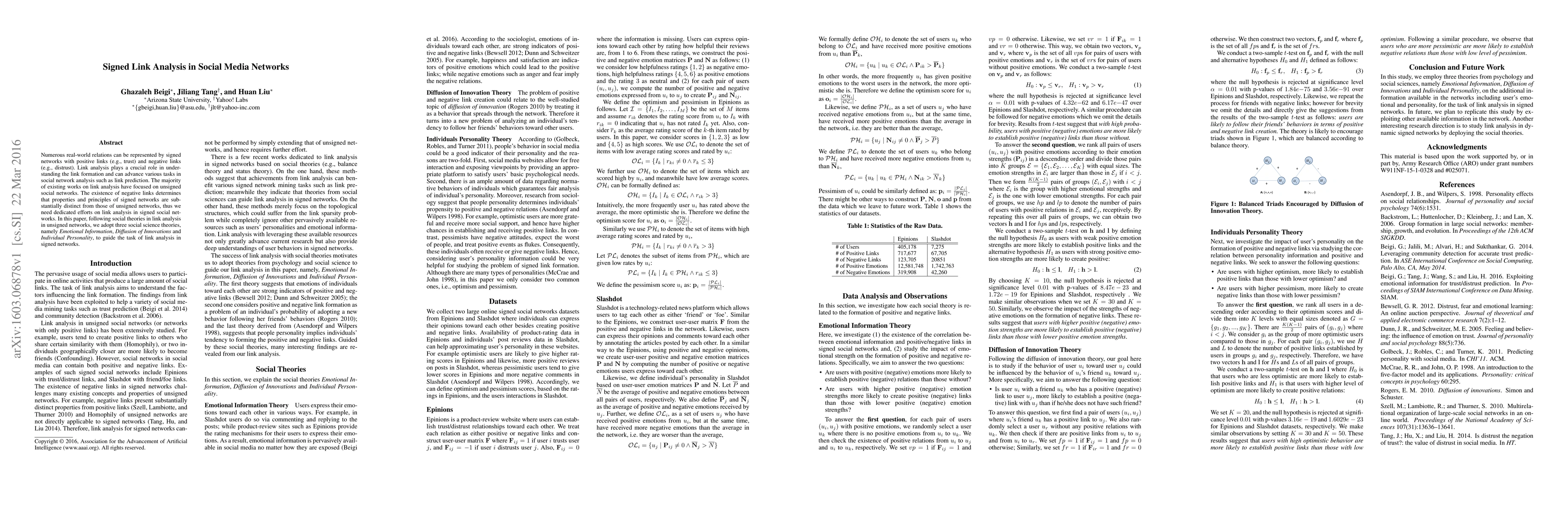 This paper explores link analysis in signed social media networks, emphasizing the unique properties of networks with both positive and negative links. It applies social science theories—Emotional Information, Diffusion of Innovations, and Individual Personality—to enhance understanding and link prediction in such networks.