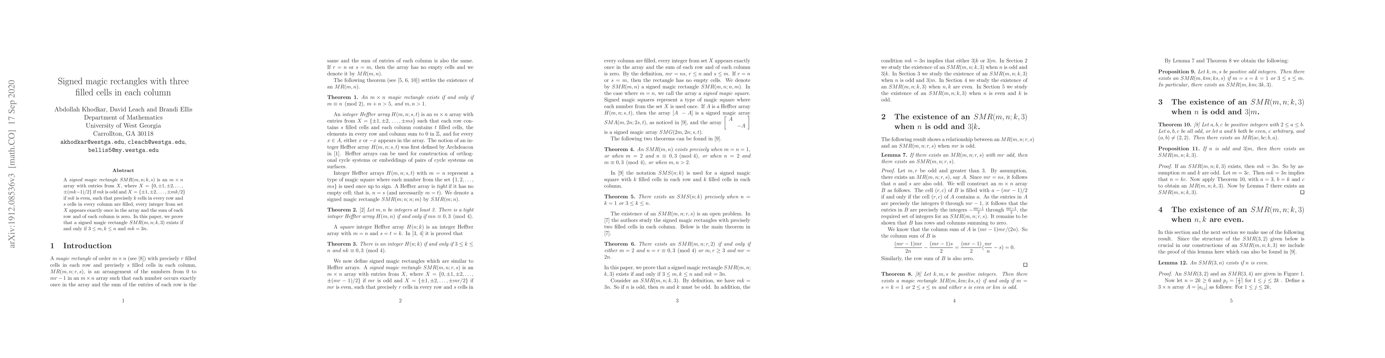 A {\em signed magic rectangle} $SMR(m,n;k, s)$ is an $m \times n$ array with entries from $X$, where $X=\{0,\pm1,\pm2,\ldots, $ $\pm (mk-1)/2\}$ if $mk$ is odd and $X = \{\pm1,\pm2,\ldots,\pm mk/2\}$ if $mk$ is even, such that precisely $k$ cells in every row and $s$ cells in every column are filled, every integer from set $X$ appears exactly once in the array and the sum of each row and of each column is zero. In this paper, we prove that a signed magic rectangle $SMR(m,n;k, 3)$ exists if and only if $3\leq m,k\leq n$ and $mk=3n$.