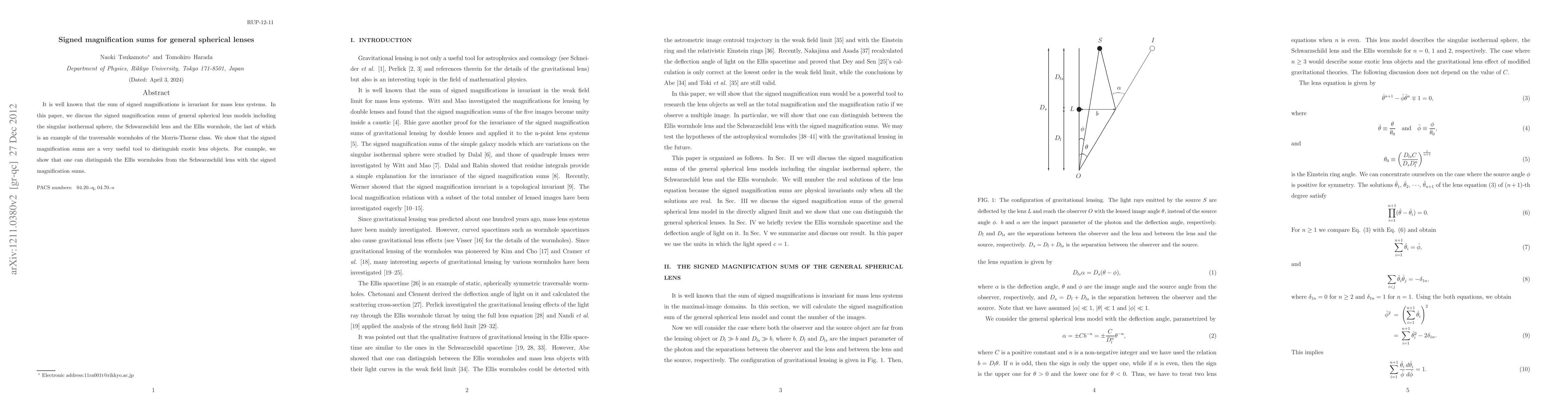 This paper investigates the signed magnification sums of various spherical lens models, including the singular isothermal sphere, Schwarzschild lens, and Ellis wormhole. It demonstrates that these sums are an effective tool for distinguishing between different exotic lens objects, such as identifying Ellis wormholes from Schwarzschild lenses.